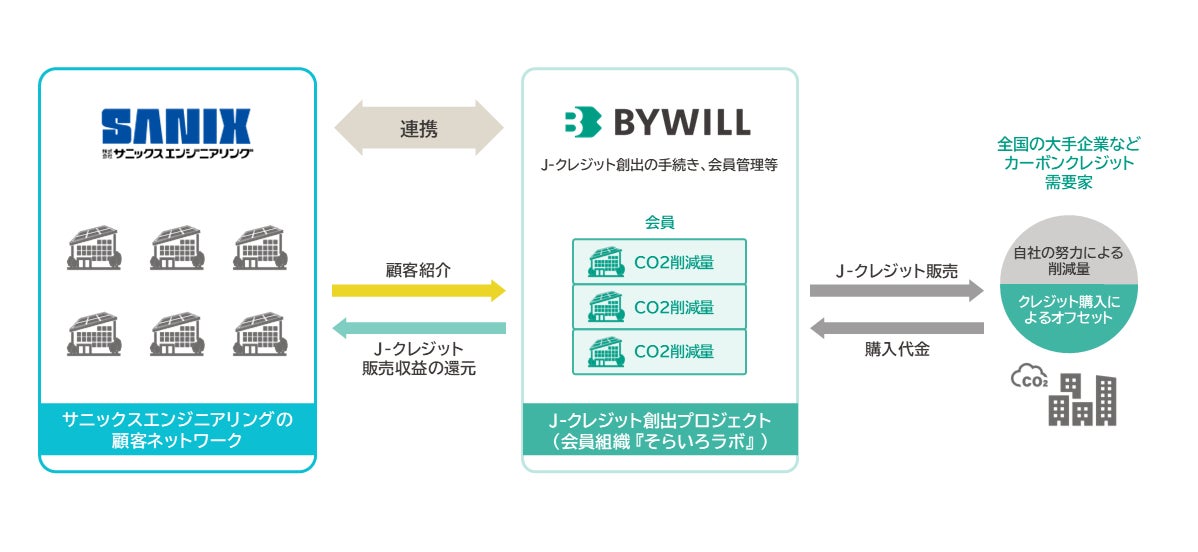 サニックスエンジニアリングは、バイウィルが運営する「法人企業における太陽光発電設備の導入」によるJ-クレジット創出プロジェクト(会員組織名『そらいろラボ』)に関して、入会ニーズを有する法人企業をバイウィルに紹介する役割を担います。