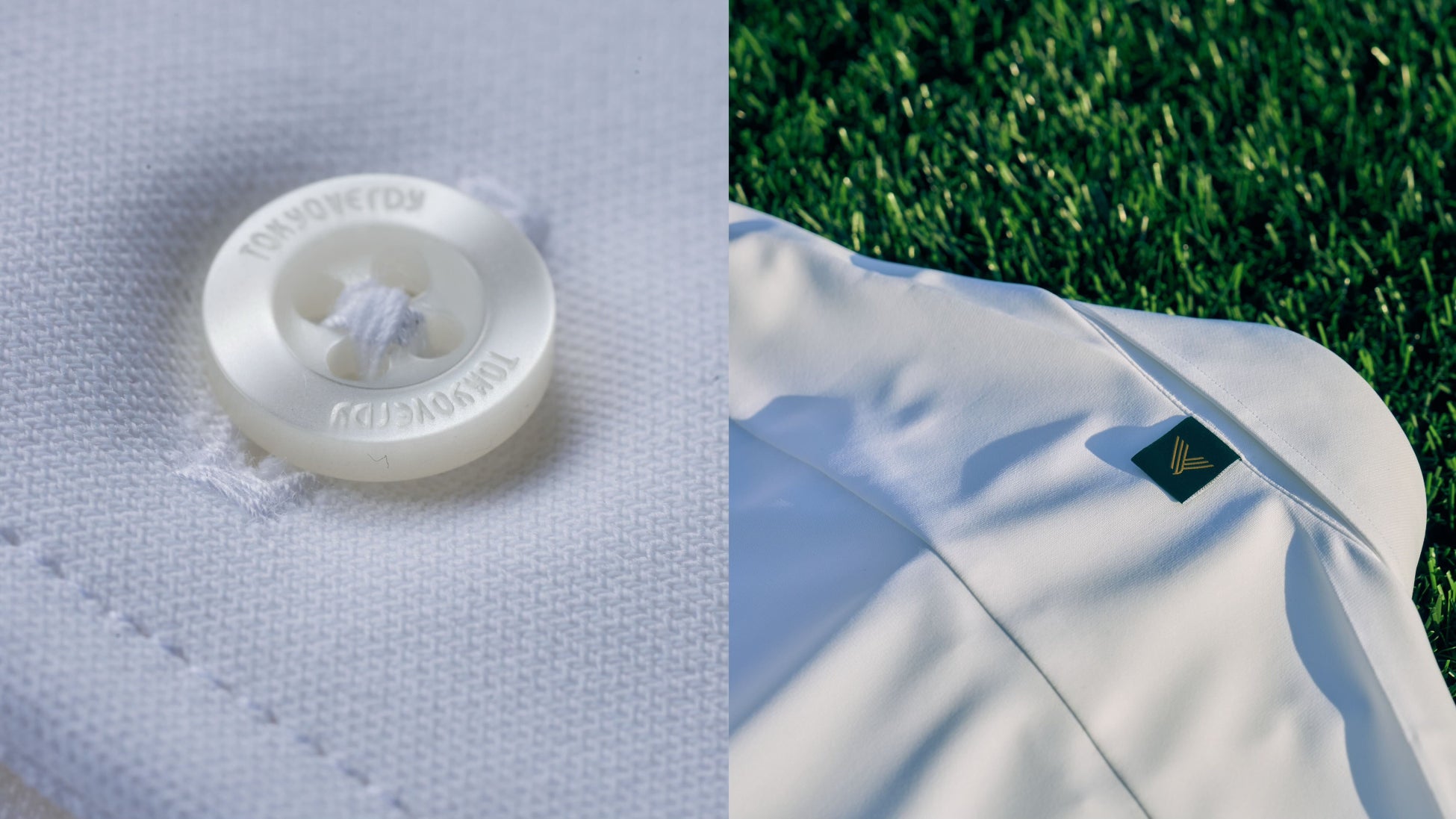 普段使いいただけるよう、コラボポロシャツと同じく、襟の後ろにVマークを刺繍したコラボタグを採用。また東京ヴェルディをさりげなく感じていただけるよう、別注ボタンを製作いたしました。