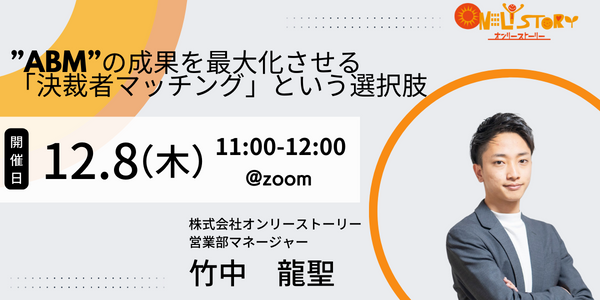 審査制・決裁者マッチングプラットフォーム「ONLY STORY」「チラCEO」(サービスサイト:https://onlystory.co.jp/service/ )を運営する株式会社オンリーストーリー(代表取締役:平野哲也、本社:東京都渋谷区)は、12月8日 (木)11時にオンラインイベント「“ABM”の成果を最大化させる『決裁者マッチング』という選択肢」を開催します。BtoB企業におけるマーケティング戦略として「ABM(Account Based Marketing)」が注目されているなか、実施後の課題や実施前の検討段階にある企業の経営者やマーケティング担当者向けに、8年間の実施してきた経験をもとにABMの成果を最大化させる手法を解説いたします。