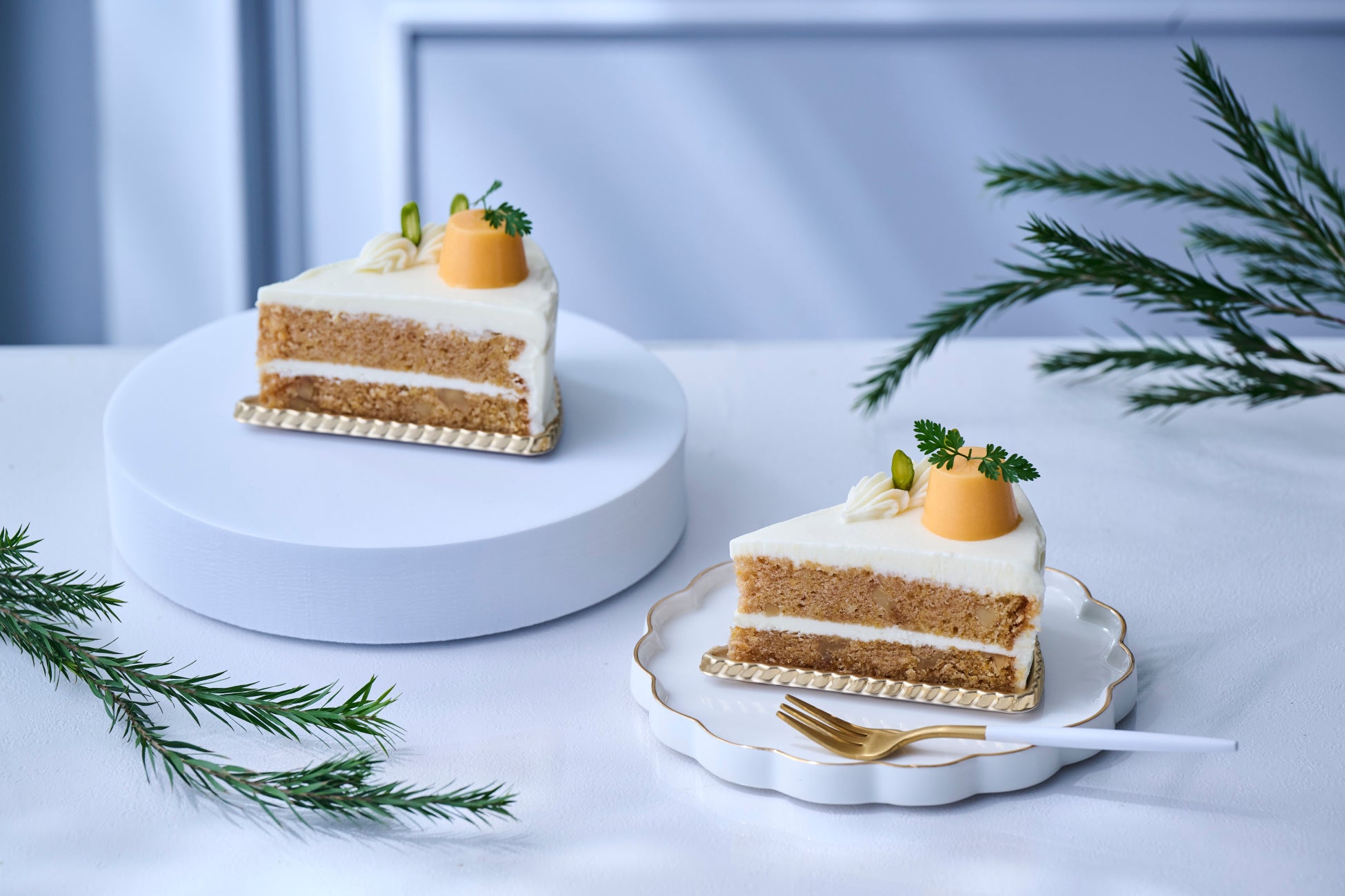 千葉県産のにんじんを練り込んだやさしい味わいの生地に、コク深いフロマージュクリームをサンドしました。トップに、にんじんをモチーフにした可愛らしいオレンジムースをちょこんと飾った、シェラトン ホテルオリジナルのキャロットケーキです。