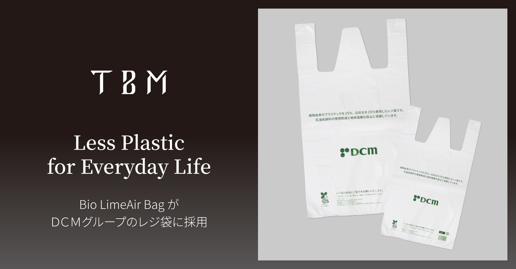 株式会社TBM(本社:東京都千代田区、代表取締役CEO:山﨑敦義、以下TBM)の石灰石を約25%とバイオマスプラスチックを含む袋「Bio LimeAir Bag(バイオ・ライムエアー・バッグ)」がDCM株式会社(本社:東京都品川区、代表取締役社長:石黒靖規、以下DCM)のDCMグループ店舗(DCM・ DCMカーマ・DCMダイキ・DCMホーマック・ DCMサンワ・DCMくろがねやおよびケーヨーデイツー)で使用されるレジ袋に採用されました。2022年8月より順次、店舗での利用が開始されます。