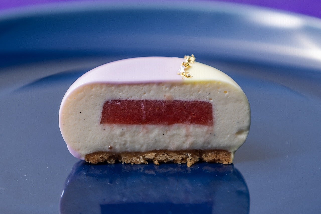 生姜とカルダモンを牛乳にじっくり漬け込み、香りをうつしたババロアの中に、爽やかな酸味のいちごジャムを閉じ込めました。今回添えられたのは、6月の誕生石「ムーンストーン」をモチーフにしたココナッツ味のゼリー。石言葉である”純粋な心”や”愛の予感”をそっと忍ばせることで、ほのかな輝きを放ちます。