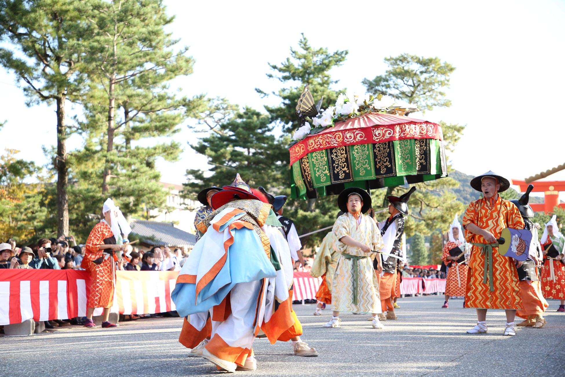 当日は桓武天皇と孝明天皇のご神霊が乗ったご鳳輦が通る「神幸祭」の後、平安時代から明治時代までの風俗衣装を身に纏った行列が通る「時代行列」がご覧いただけます。