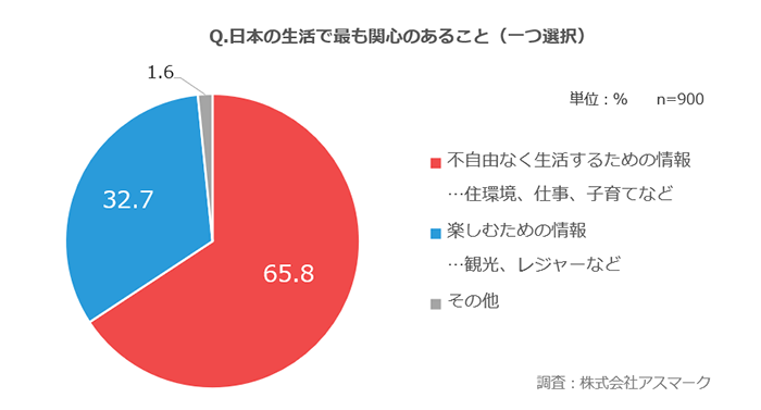 また、当社が実施した在留外国人を対象としたアンケートによると、日本の生活において最も関心のあることは、住環境や仕事・転職・子育て等「不自由なく生活するための情報」が65.8%を占め、観光・レジャーといった「楽しむための情報(32.7%)」よりも関心が高いことがわかります。(調査実施:2021年3月30日~4月5日)