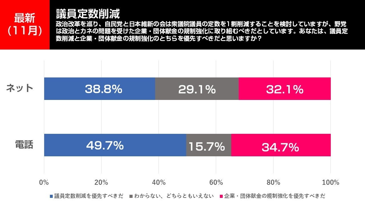 電話調査では議員定数削減を優先すべきとの回答が約半数を占め、ネットでは定数削減が企業・団体献金を若干上回る結果となりました。