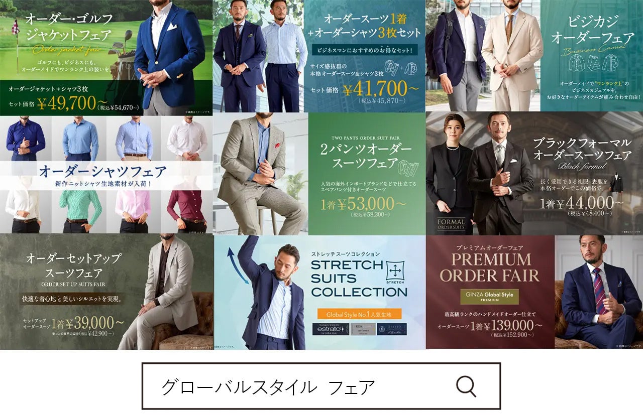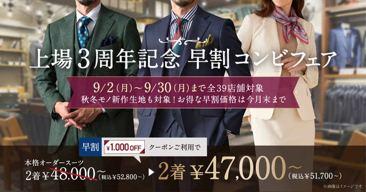 オーダースーツ専門店「グローバルスタイル」を運営するグローバルスタイル株式会社(東京証券取引所 スタンダード市場:7126、本社:大阪市中央区、代表取締役社長 田城弘志)は、9月2日 (月)から9月30日(月)までの期間中、対象プランご利用で、本格オーダースーツ2着:47,000円~(税込51,700円~)+高級オプション3,000円分または、 GSクローゼット4000円相当を選べる【上場3周年記念 早割コンビフェア】を全39店舗で開催いたします。