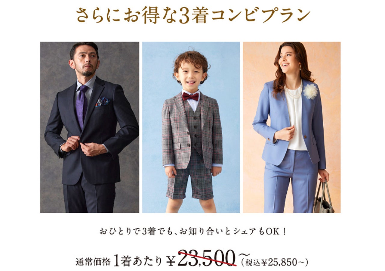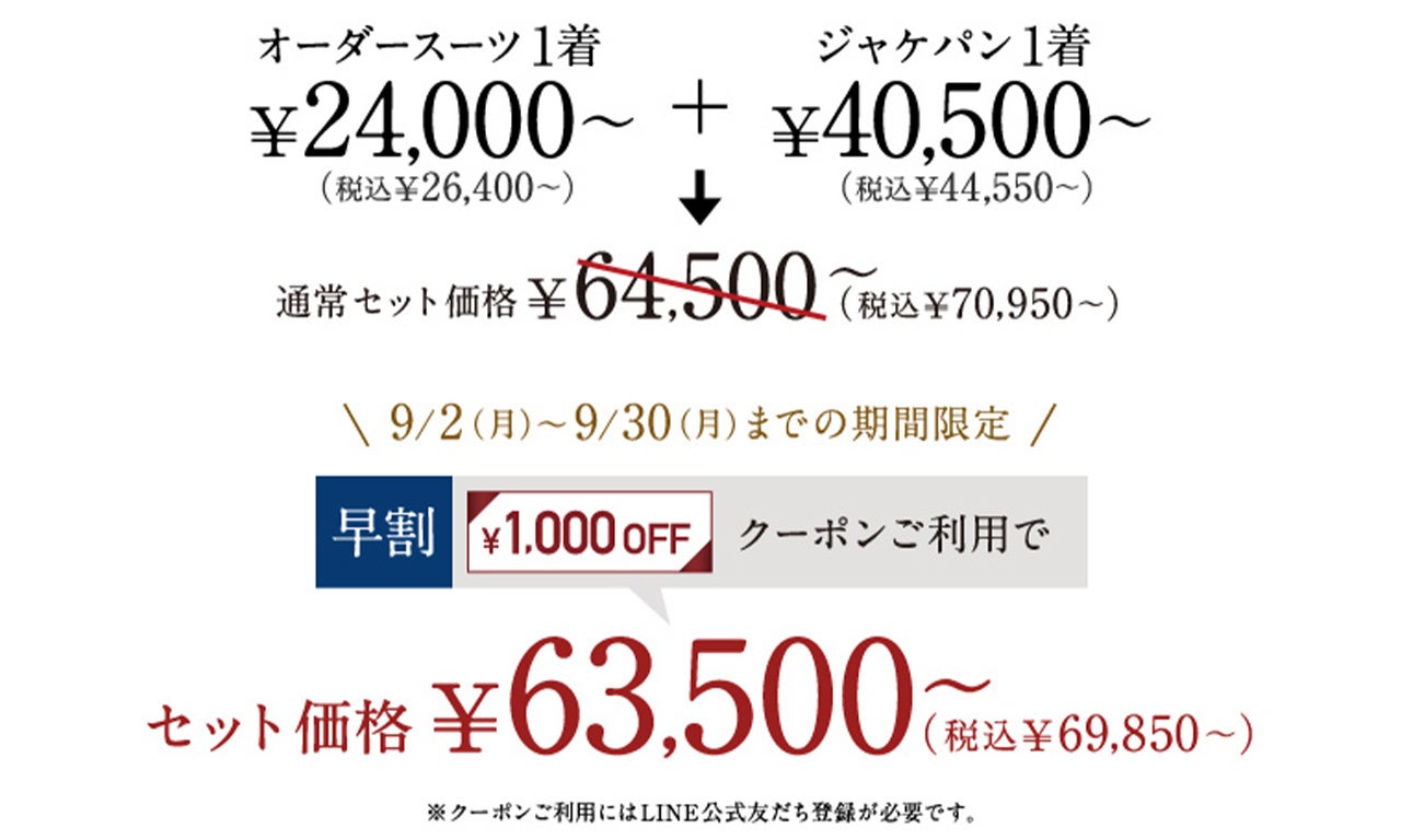 ※コンビプランとは・・・オーダースーツ2着以上ご購入していただいた場合の1着あたりのお値段です。組み合わせは自由ですので、異なる価格帯のオーダースーツと組み合わせていただいても本価格が適用されます。