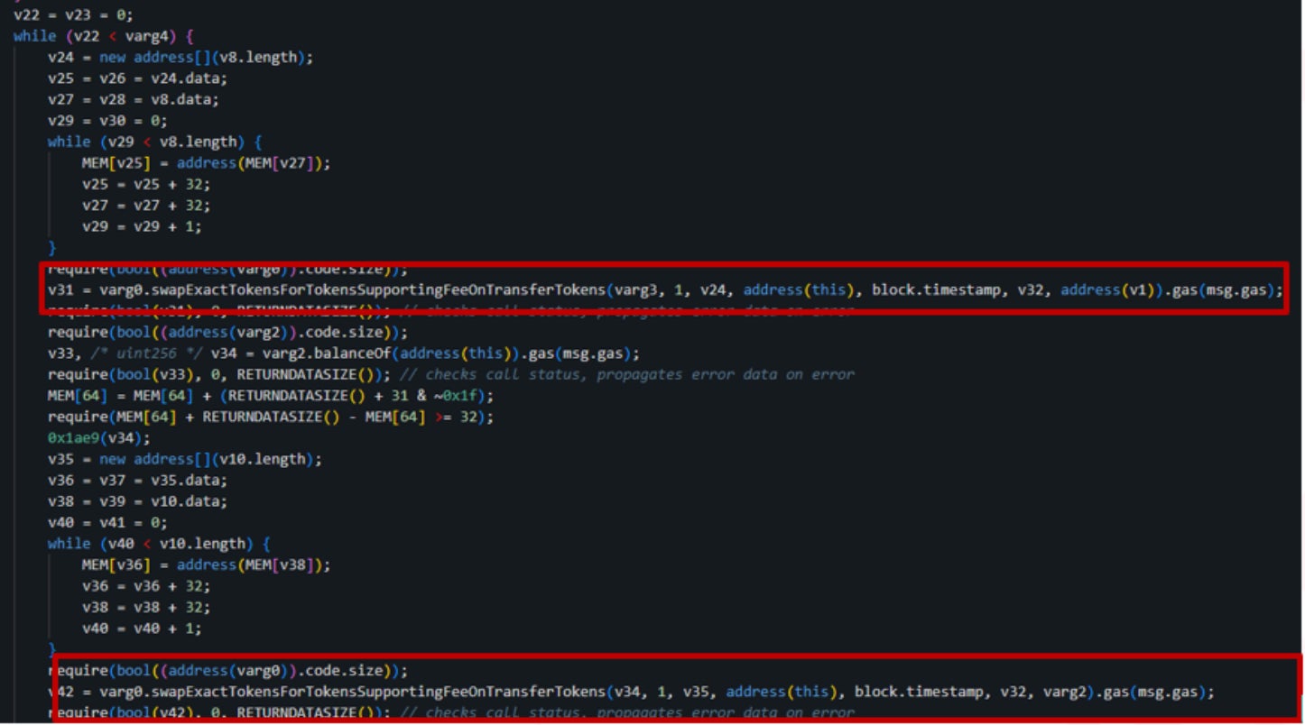 上記の画像の関数についてより深く見てみると、詐欺犯がWETH(varg1)からGROK(varg2)、またはGROKからWETHへのスワップを9回実行(varg4)するために、Uniswapルーター(varg0)から関数「swapExcatToekensSupportingFeeOnTransferTokens」を使用し、総額42万ドルを使ってトークンの量を底上げし、それを購入するトレーダーやボットをおびき寄せていることが分かります。