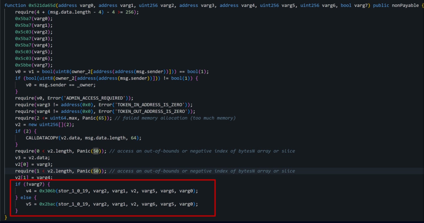 関数 0x521da65dは詐欺犯のトークンを売買する役割を持ち、この関数はこのトークンだけで226回実行されています。この関数の挙動は、2つの個別の実行ルートにつながる行程を指示するBoolean変数varg7で条件づけられています。