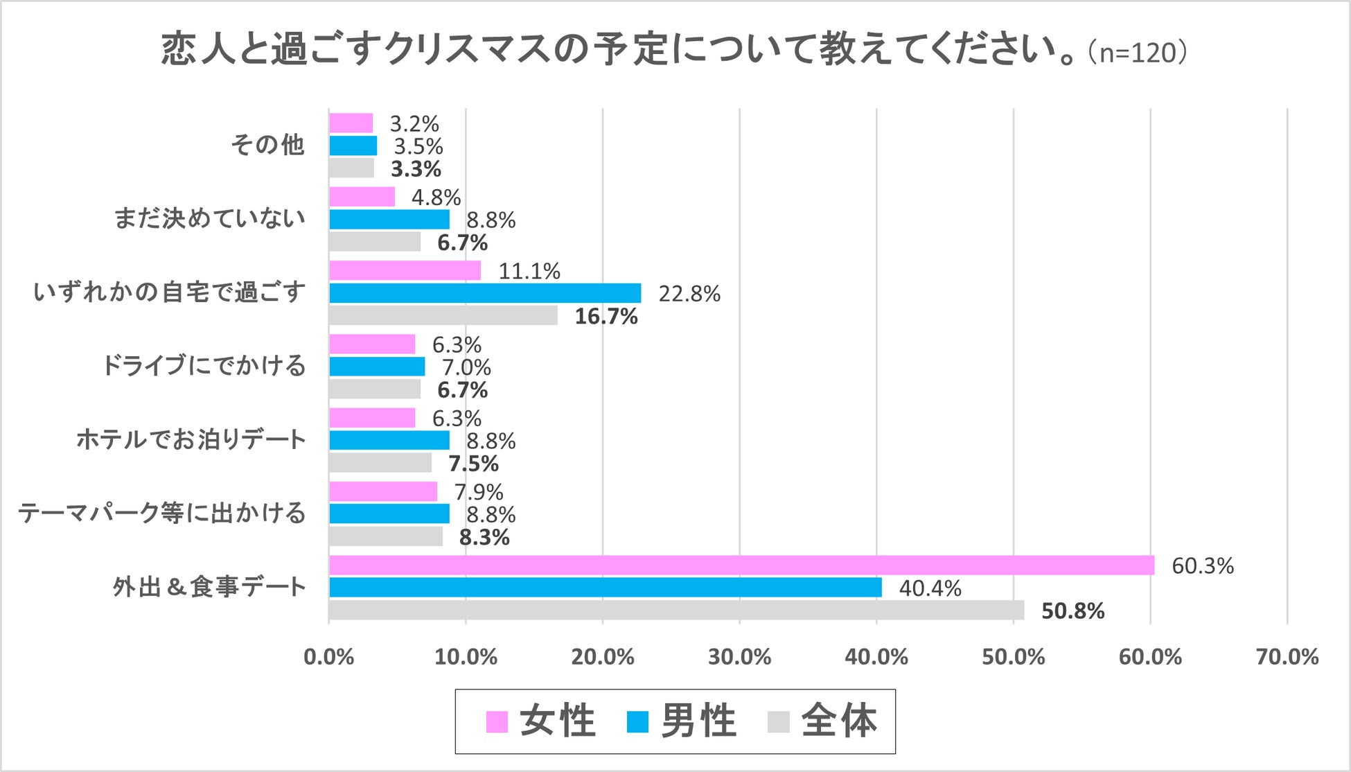 最も多かった回答は、「外出&食事デート」で、全体で50.8%、男性が40.4%、女性が60.3%という結果となり、「恋人と過ごす予定」と回答したうちの約5割は「外出&食事デート」を予定しているということがわかりました。次に多かった回答は、「いずれかの自宅で過ごす」という回答で、全体で16.7%、男性22.8%、女性11.1%という結果となり、3番目以降は、ほぼ同割合の回答結果で、「テーマパークに出かける」が全体で8.3%、「ホテルでお泊りデート」が全体で7.5%、「ドライブに出かける」が全体で6.7%、そして「まだ決めていない」という回答が6.7%という結果となりました。
