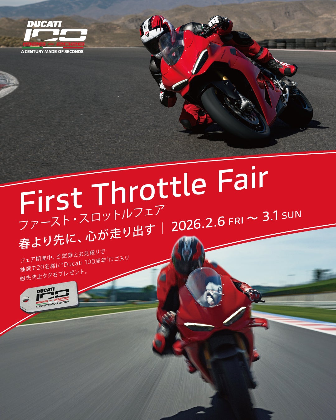 本フェアでは、ドゥカティ100周年ロゴを冠した世界最薄クラスの紛失防止タグを、抽選で20名様にプレゼント。