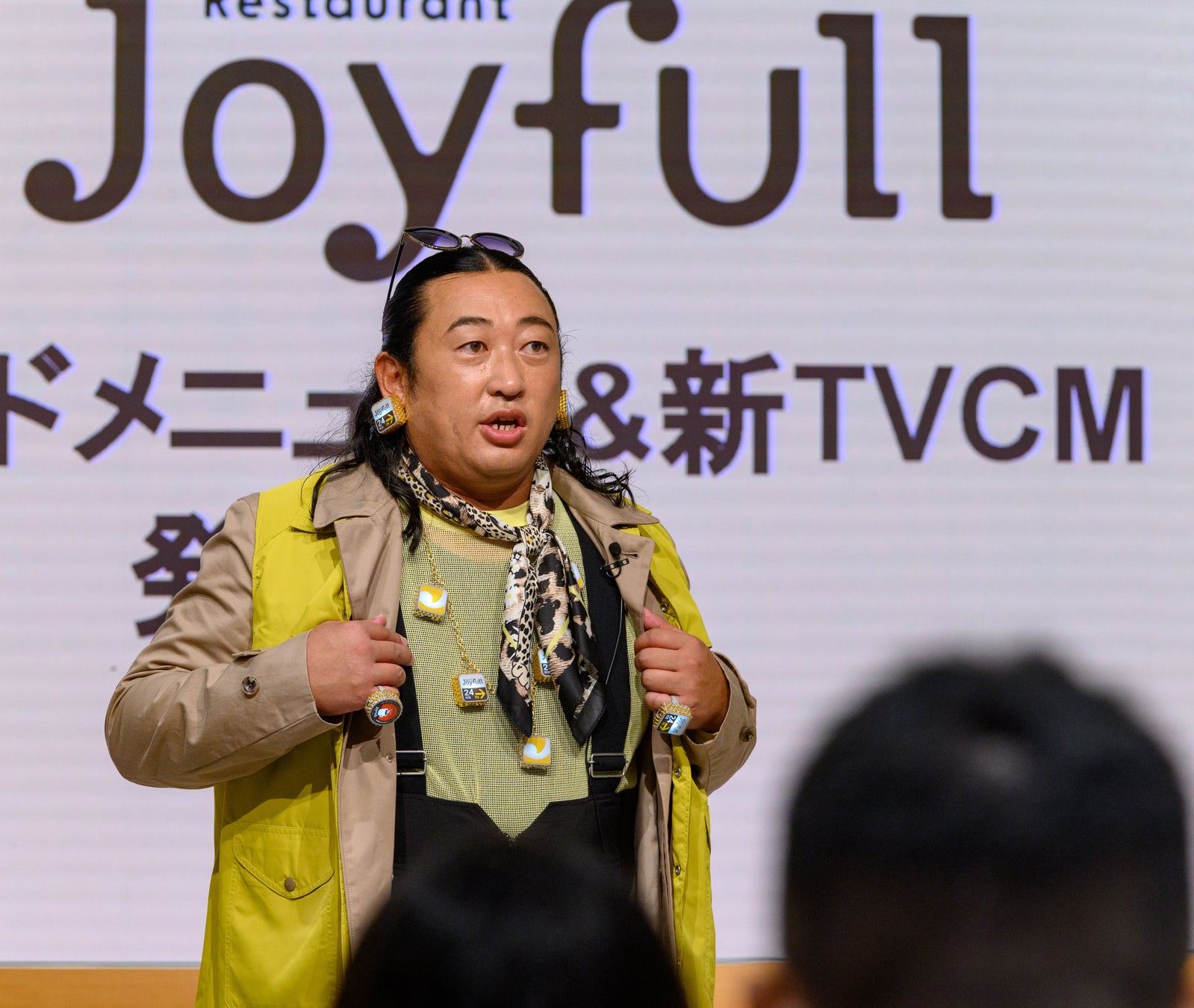 ジョイフルカラーの黄色に身をつつまれ登場したロバート秋山竜次さん。着用のベストは作業服からリメイク、ネックレスや指輪・イヤリングはジョイフル看板のカプセルトイからアレンジしたそう。また今回撮影したTVCMを振り返り「最後のシーンの女の子役は気に入っています」と撮影時のセリフとポーズを改めて再現いただき、会場全体が笑いに包まれました。