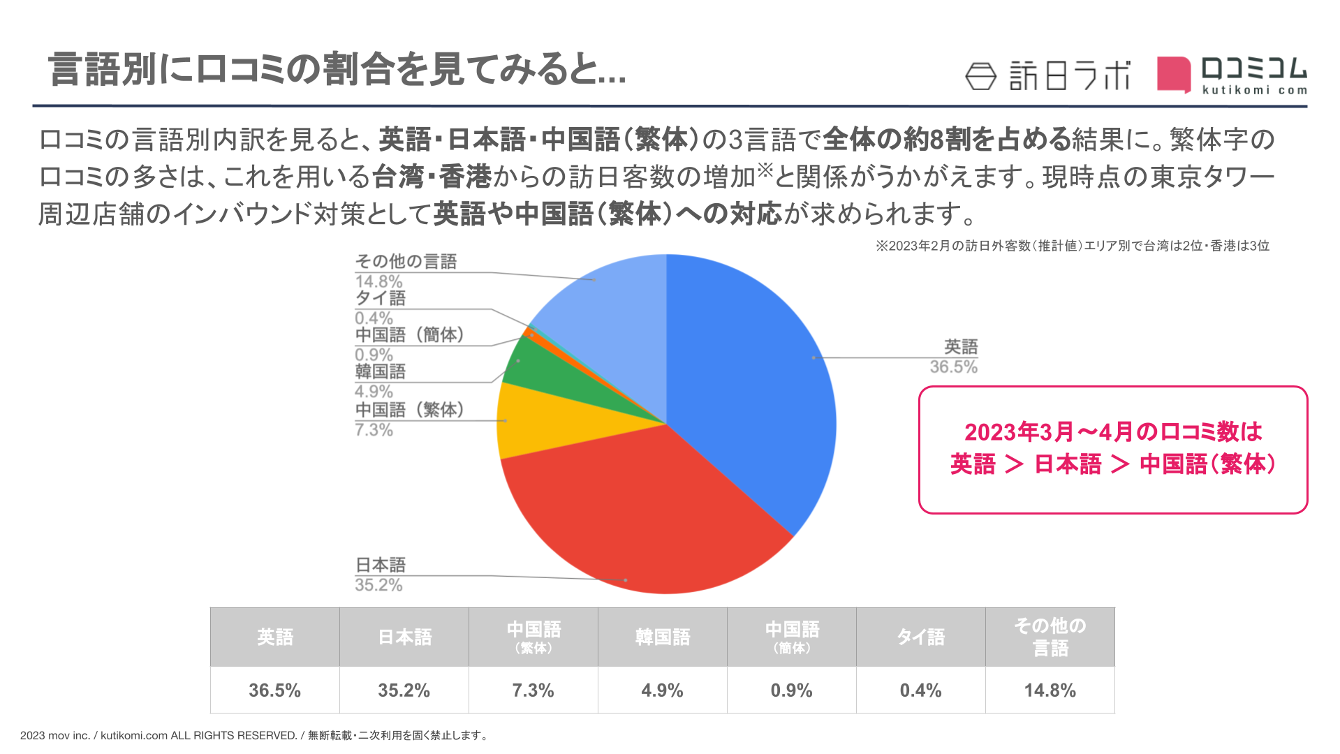 口コミの言語別内訳を見ると、英語・日本語・中国語(繁体)の3言語で全体の約8割を占める結果に。繁体字の口コミの多さは、これを用いる台湾・香港からの訪日客数の増加※と関係がうかがえます。現時点の東京タワー周辺店舗のインバウンド対策として英語や中国語(繁体)への対応が求められます。