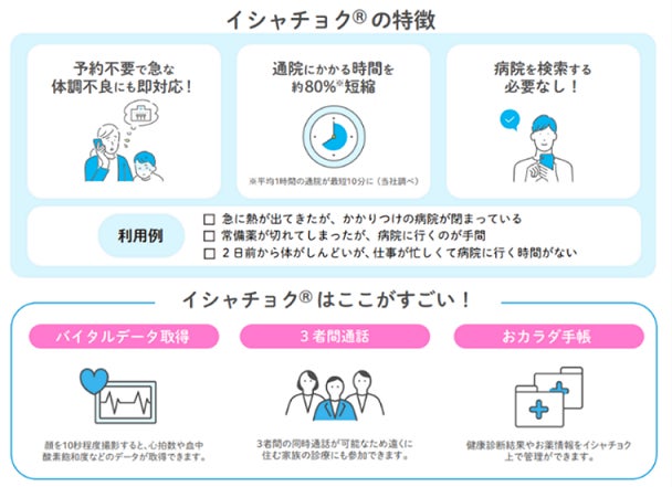 このたびのオンライン診療「イシャチョク」特別プランは、「病院へ行く時間がない」「勤務時間後では間に合わない」「具合が悪過ぎて病院や調剤薬局へ行けない」「ちかくに医療機関がない」「歩行が困難」「離れて暮らす親の通院に付き添えない」「病院の待ち時間が長すぎる」「子どもがスイミングで熱を出した」といった多くのお悩みの声をもとに企画・開発したものです。会員の皆さまの大切な時間を有効に活用し、体調が優れない時にも寄り添える特別なサービスを目指しました。