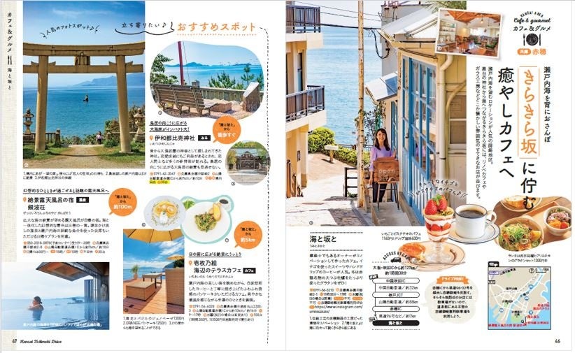 SNSで話題の絶景スポットやニューオープンの複合施設など、今いきたい旬の人気スポットを、「絶景ドライブ」「カフェ&グルメ」「体験」「お買い物」の4つのテーマでセレクト。35のスポットを1施設見開きで、しっかり紹介しています。車で立ち寄りやすい周辺のスポット情報も盛込み、1日たっぷり遊べる内容になっています♪