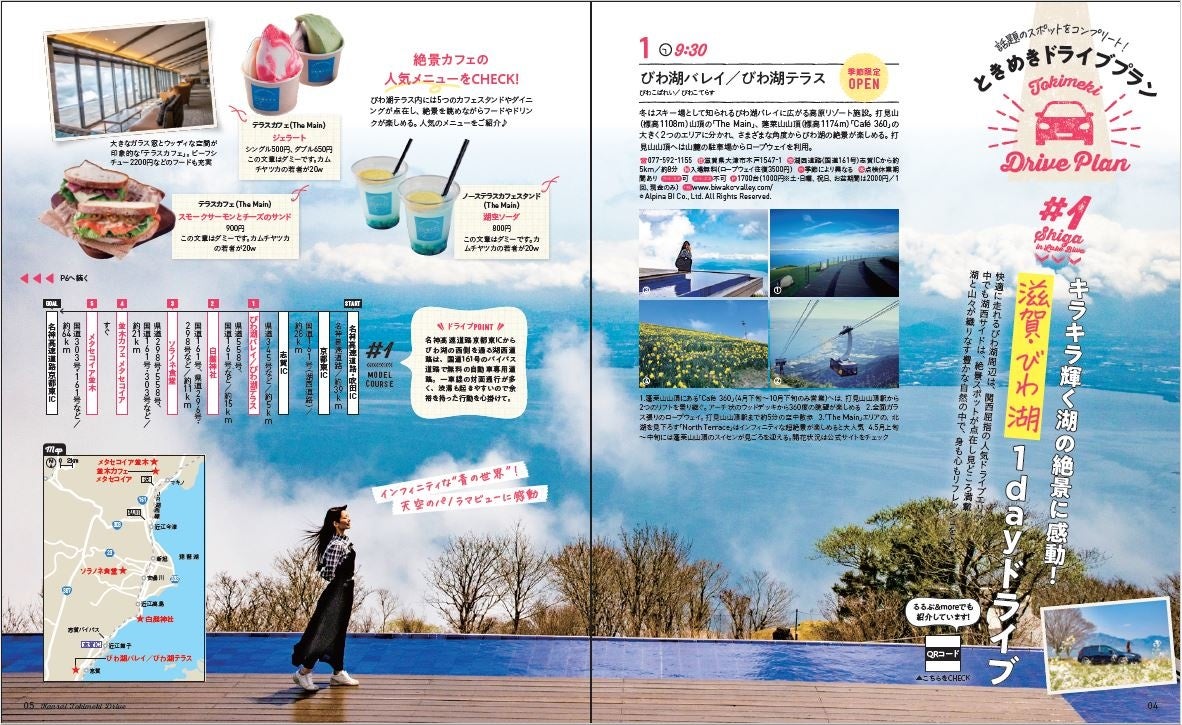関西屈指の人気ドライブエリアを巻頭大特集!幻想的な湖の絶景スポットが点在する滋賀・湖西エリア、近年特に人気が高い兵庫のリゾートアイランド・淡路島を1dayプランのモデルコースで紹介しています。日本最大級の商業リゾート施設として大注目の三重県多気町「VISON」も番外編でピックアップ。