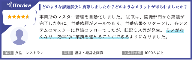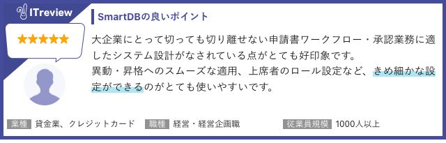 「ITreview」にて、SmartDB(R)を利用中のユーザーから、以下のような評価をいただいています。