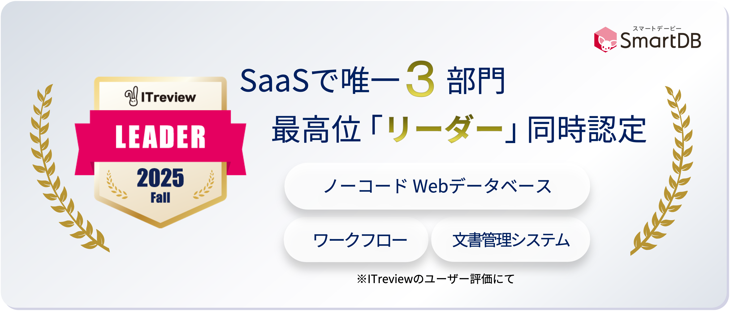 SmartDB、「ITreview Grid Award 2025 Fall」にて14期連続受賞 -SaaSで唯一となるノーコードWebデータベースなど3部門同時の最高位「Leader」に認定-