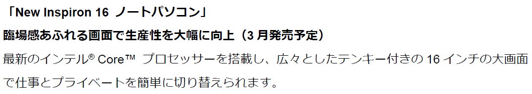 ※その他の詳細は、製品ページをご参照ください。「New Inspiron 16 ノートパソコン」の製品ページは発売に合わせて公開されます。
