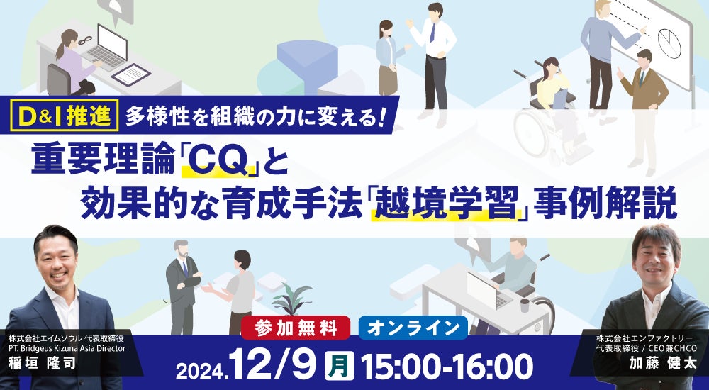 株式会社エンファクトリー(東京都千代田区、代表取締役社長CEO加藤健太、以下、弊社)は、株式会社エイムソウル(東京都台東区、代表取締役/PT. Bridgeus Kizuna Asia Director稲垣 隆司)とともに、2024年12月9日(月)15:00に、『【D&I推進】多様性を組織の力に変える重要理論「CQ」と、効果的な育成手法「越境学習」事例解説』を開催いたします。