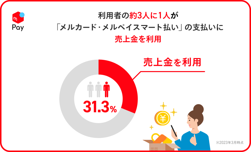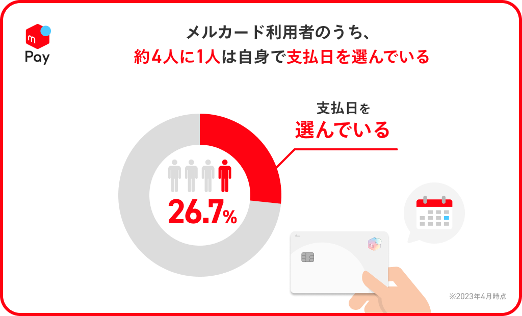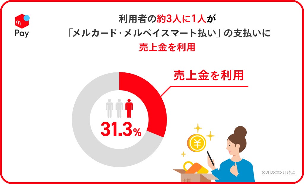 「メルカード」や「メルペイスマート払い」ではお客さまがご利用分の支払いタイミングを選ぶことができ、支払いの柔軟性が高いことが特徴です。2023年4月時点では、「メルカード」と「メルペイスマート払い」利用者のうち、4人に1人以上(26.7%)が自身で支払日を選択していることが分かっています。また、約3人に1人(31.3%)が支払いに「メルカリ」の売上金を充てていると回答しています。いつもの給与とは異なるタイミングで手元に入る売上金で、自動引落しを待たずにすぐに清算できる柔軟な支払い方法が求められてきました。一方で清算が完了しても利用枠の回復は翌月だったため、利便性向上のために支払い後すぐに「あと払い利用枠」を回復させ、新たなお支払いにお使いいただける機能を追加いたしました。