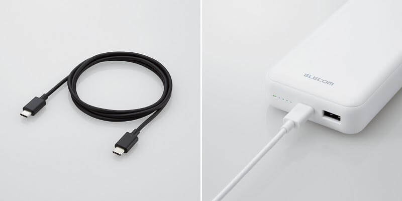 USB Type-C(USB-C) to USB Type-C(USB-C)ケーブルを付属しています。付属のケーブルを本製品の充電用USB Type-C(USB-C)ポートに接続し、対応したACアダプターに接続することで充電可能です。