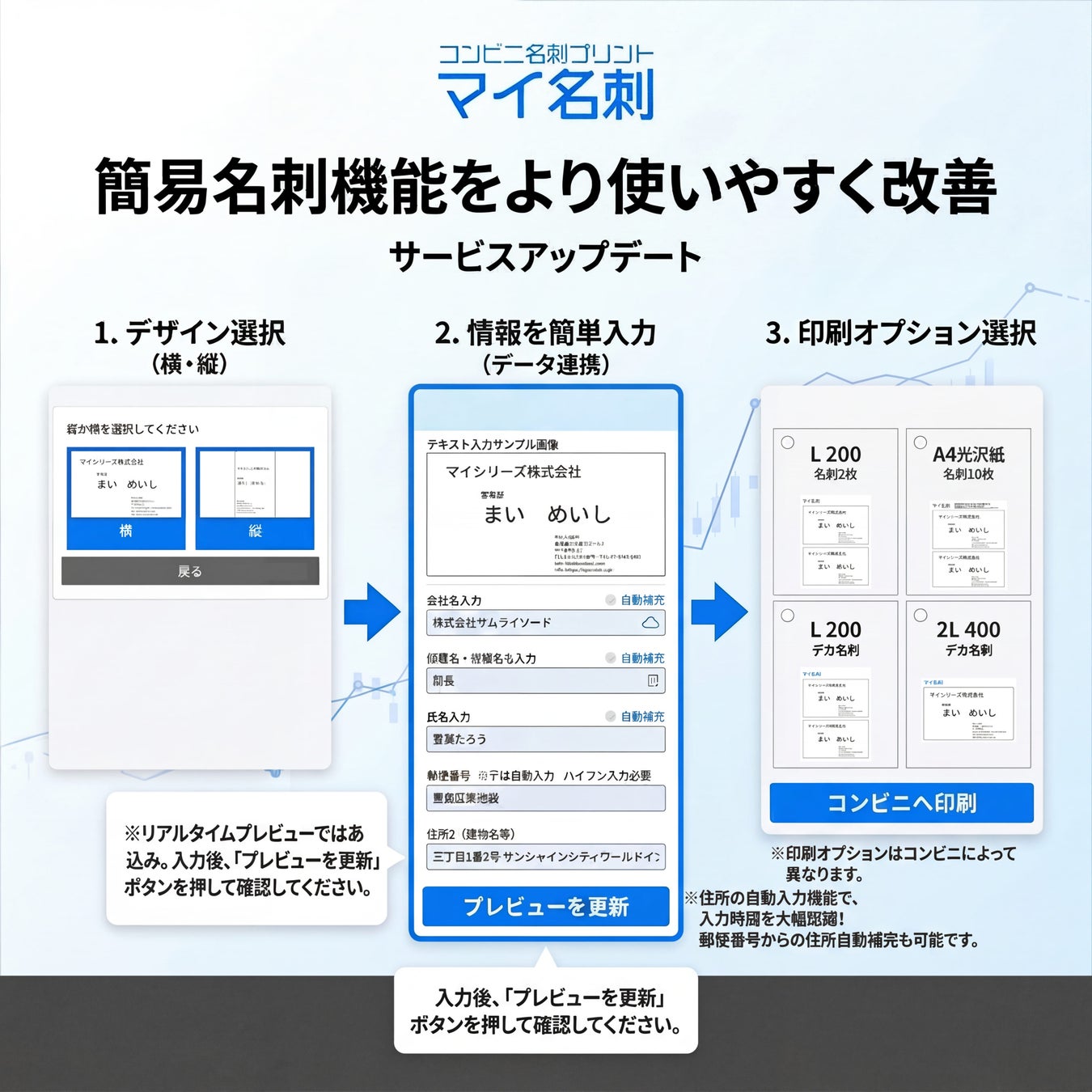 コンビニプリントサービス『マイ名刺』は、このたび簡易名刺機能の操作性を見直し、より使いやすく改善しました。会社名・氏名・役職・連絡先などをWeb上で入力するだけで名刺データを作成し、全国のコンビニで即日印刷できるサービスとして、急な人事異動や新入社員配属などで名刺が必要になる場面を支援します。