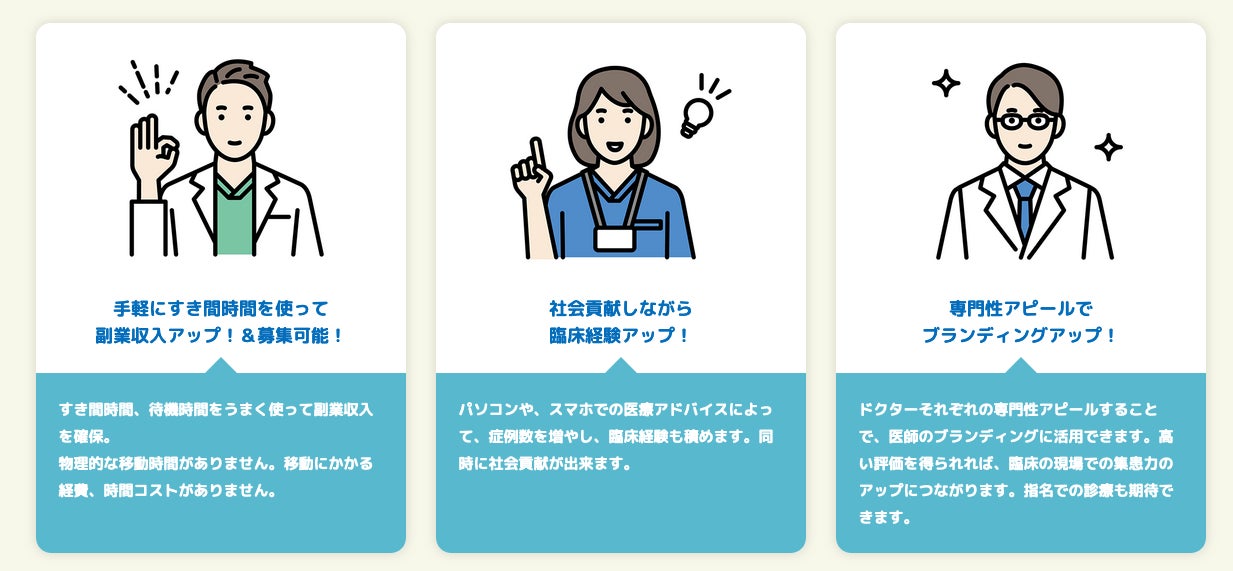 一方、医師は、自宅や医局にながらにして、アルバイトができます。(提供するのは医療アドバイスです。)