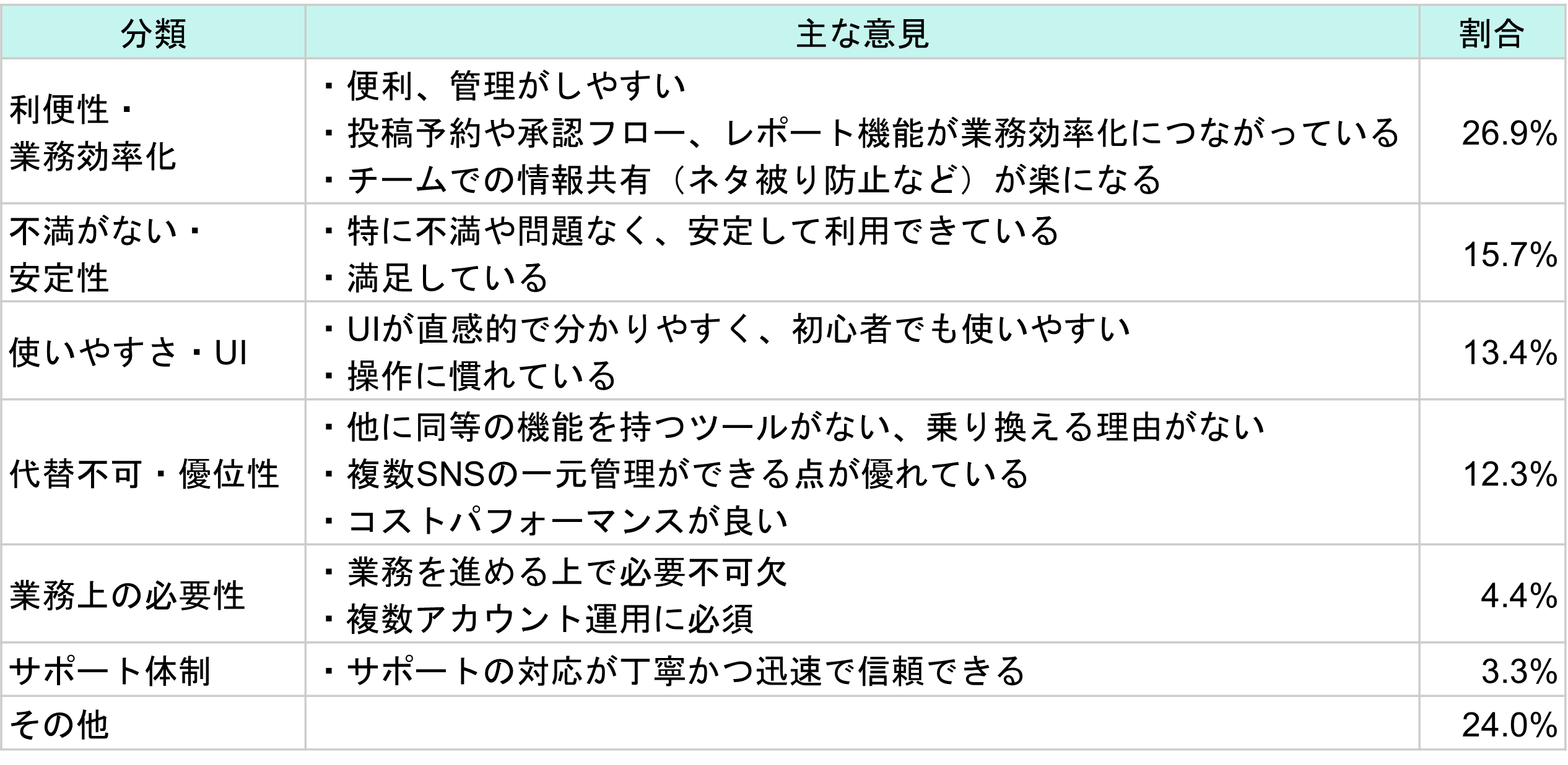 「満足度」を伺ったところ、「とても満足している」と「まあ満足している」の合計は85.2%で、こちらも9割に近いポイントとなりました。「不満」という意見はほぼ見られず、多くのお客様に好評価をいただいていることがわかりました。「満足」と回答した理由として、「UIが分かりやすく、初心者でも直感的に使える」、「複数人でのアカウント管理がしやすい」、「コメント監視機能が素晴らしい」と回答する方が多く、他にも複数の好意見をいただいています。