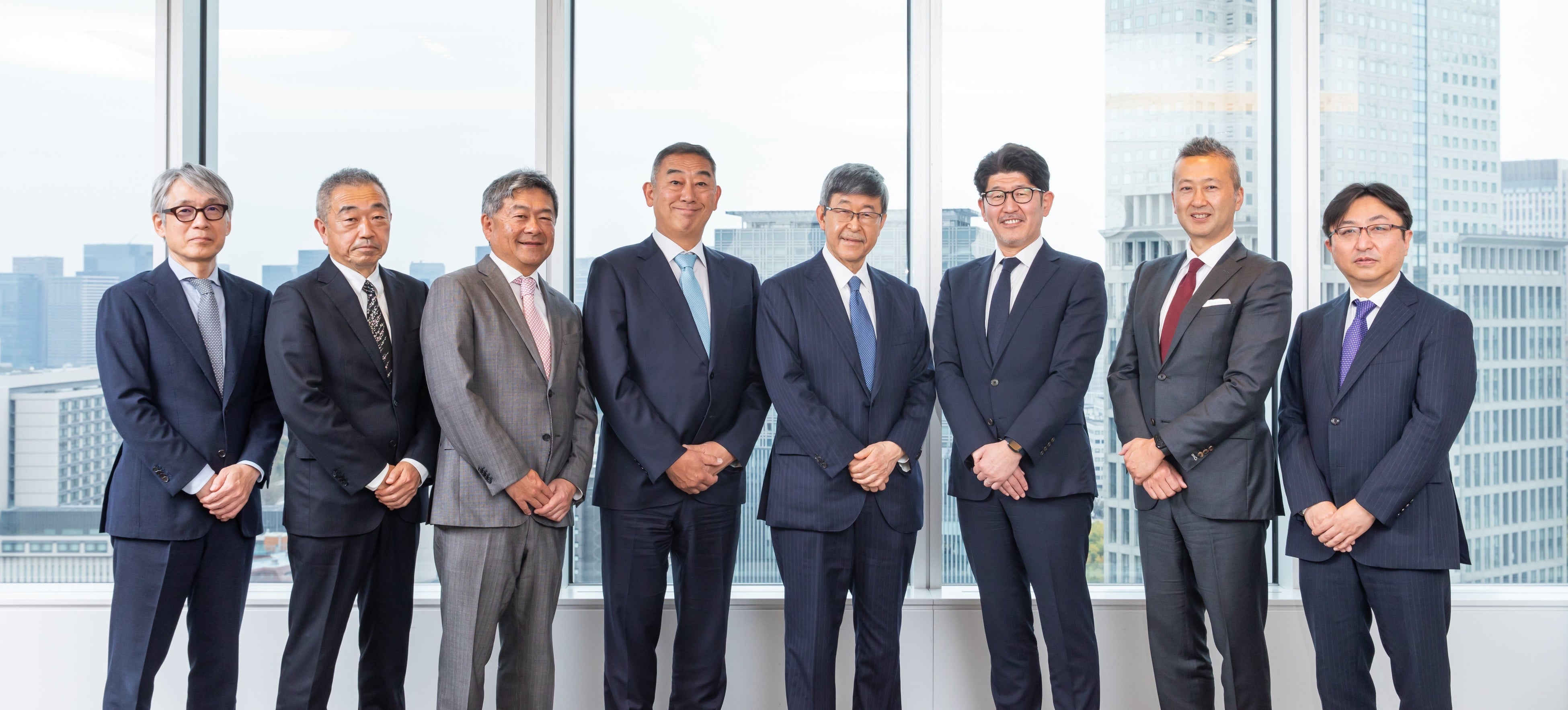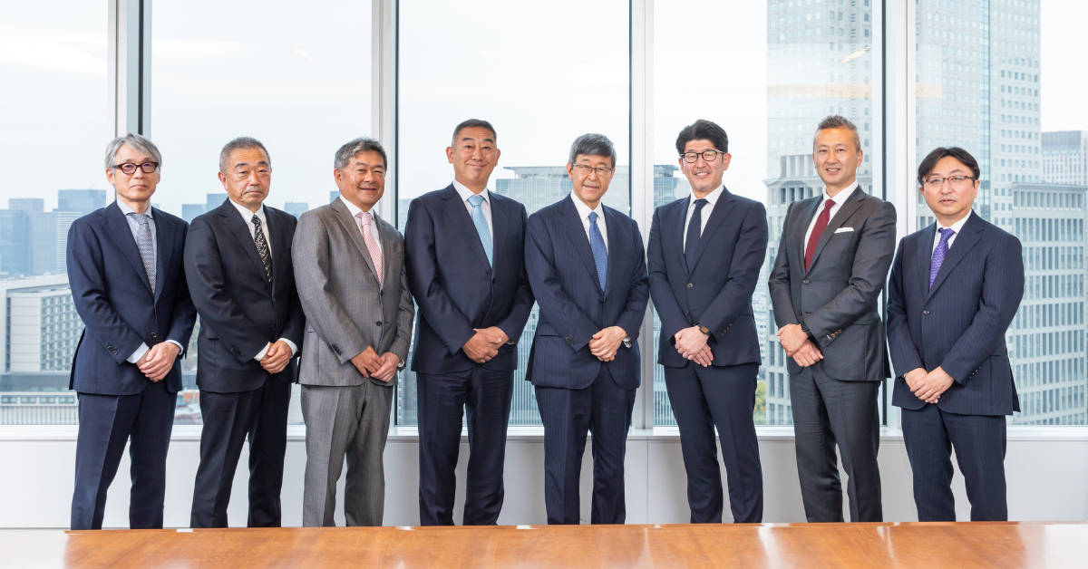 写真左から:株式会社博報堂DYホールディングス 取締役専務執行役員 江花 昭彦、取締役専務執行役員 西岡 正紀、取締役副社長 矢嶋 弘毅、代表取締役社長 水島 正幸、代表取締役会長 戸田 裕一、ソウルドアウト株式会社 代表取締役会長CGO荻原 猛、代表取締役社長CEO荒波 修、取締役CFO 半田 晴彦