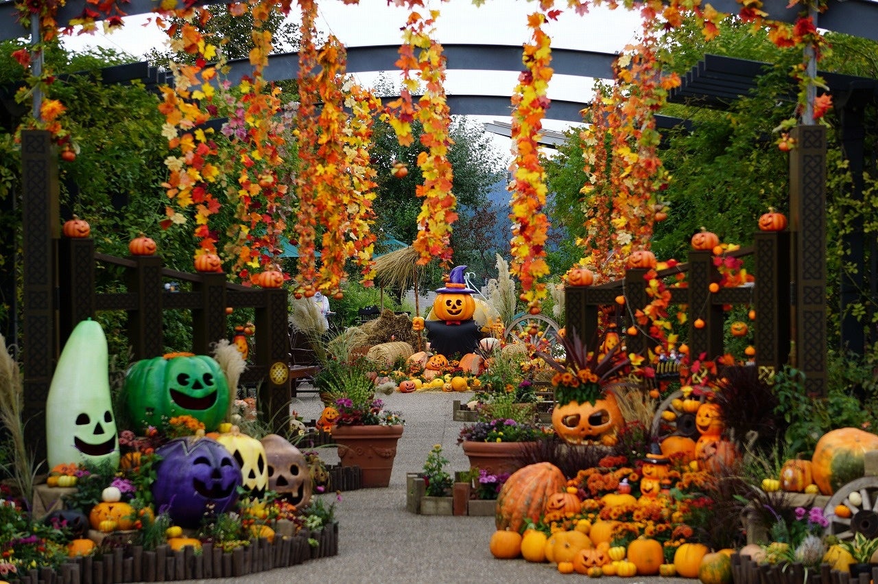 芳香な秋バラに包まれてハロウィン装飾を楽しめる
