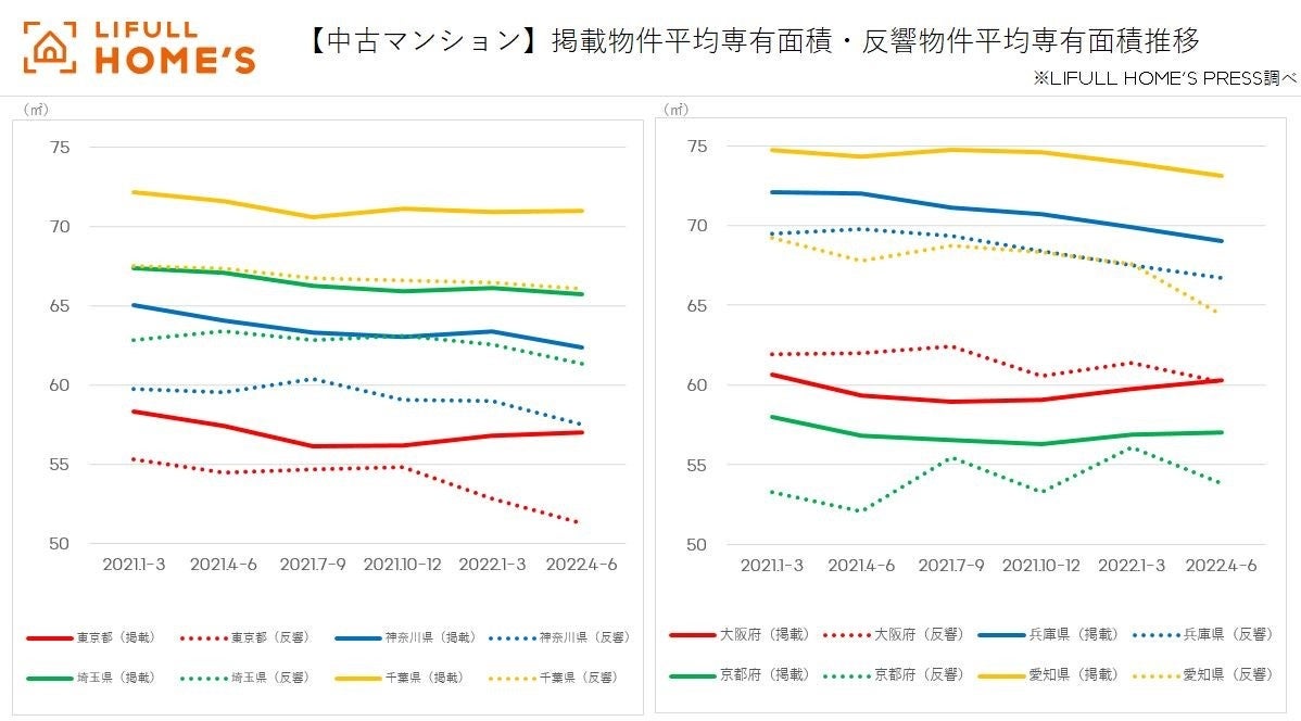 ▽首都圏では平均専有面積が掲載・反響物件ともに拡大に向かう