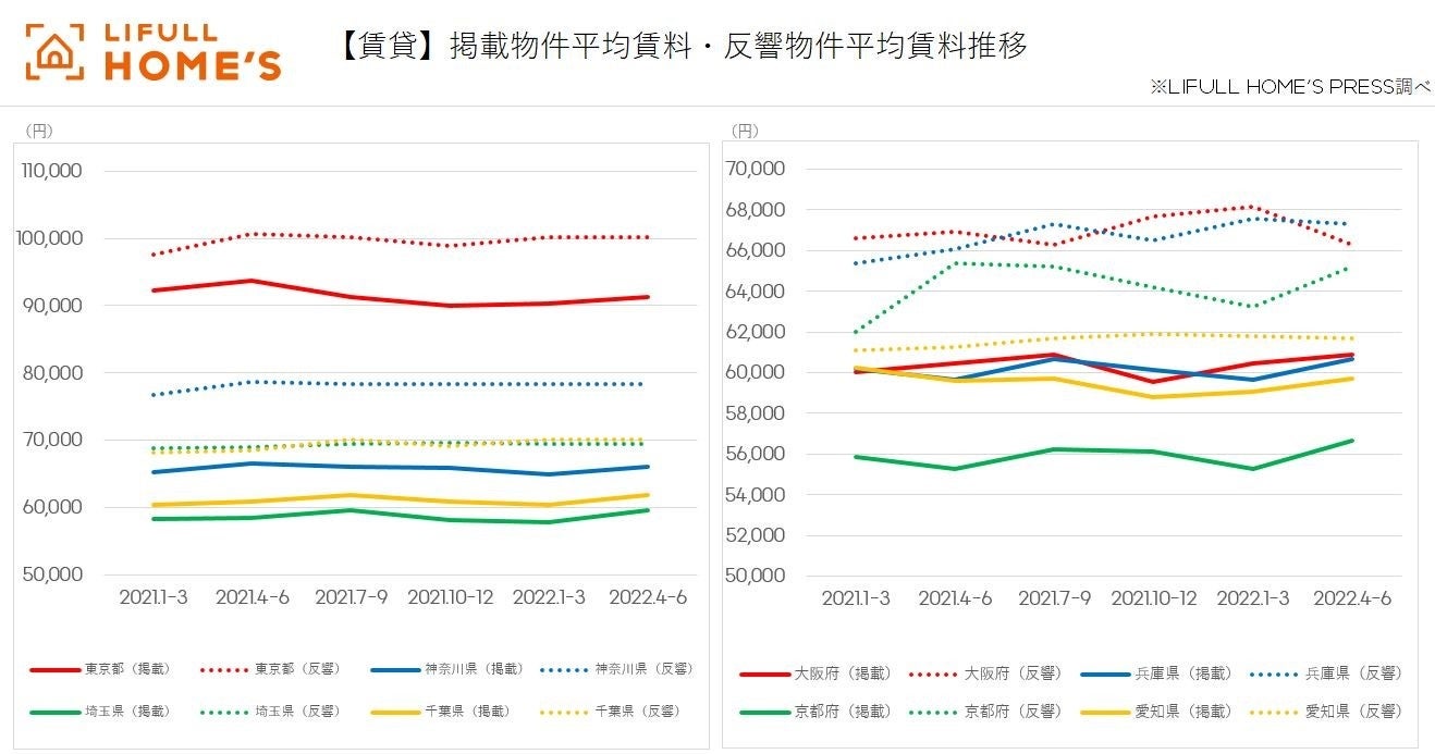また、反響物件の平均賃料は、掲載平均賃料とおおむね同様の動向となっています。