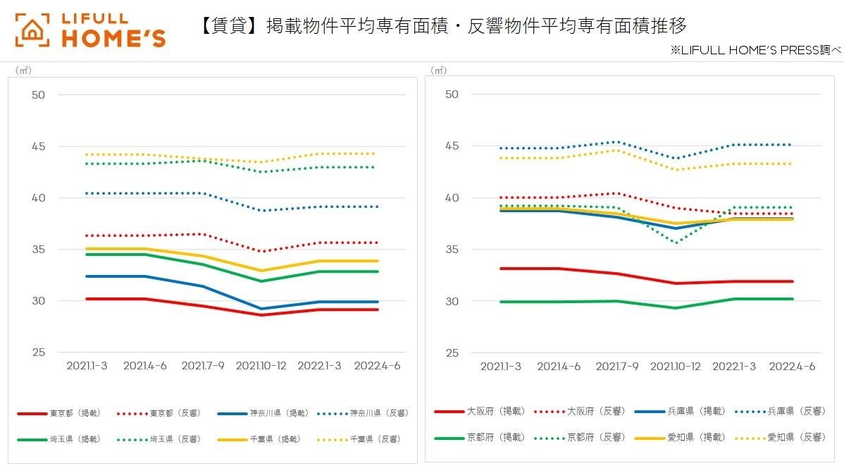 その他の地域では、大阪が31.88㎡で前期比100.7%前年比96.3%、愛知県が37.89㎡で前期比101.0%、前年比97.4%などとなっています。