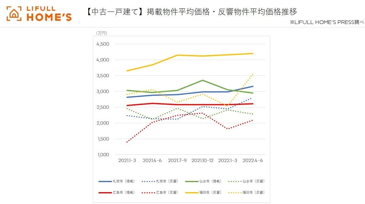 反響物件平均価格は、仙台市が2,282万588円で前年比108.0%、広島市が2,085万7,738円で同103.4%といずれも上昇傾向となり、なかでも掲載平均価格が上昇する札幌市は2,801万5,784円で同131.3%、福岡市は3,542万5,497円で同115.9%と、掲載平均価格の上昇率を超える、反響平均価格の上昇率となっています。なお、2022年7月に国税庁が発表した標準宅地の路線価において、札幌市が属する北海道は対前年平均変動率+4.0%、福岡市が属する福岡県は同+3.6%と、都道府県別の対前年平均変動率ではそれぞれ全国1位と2位となっています。