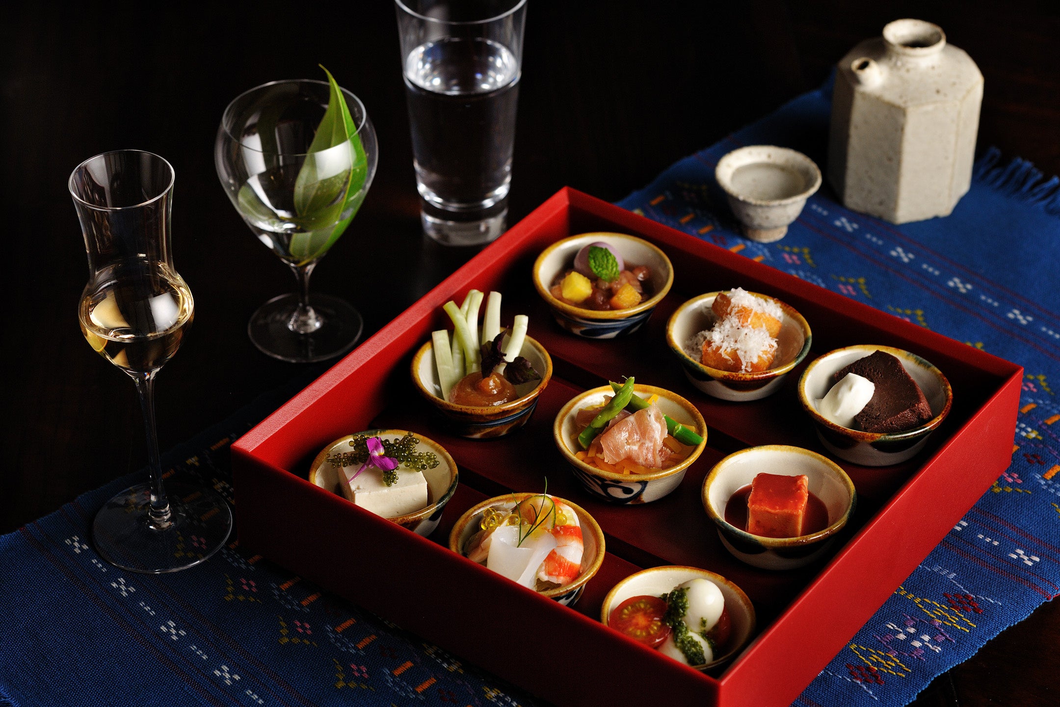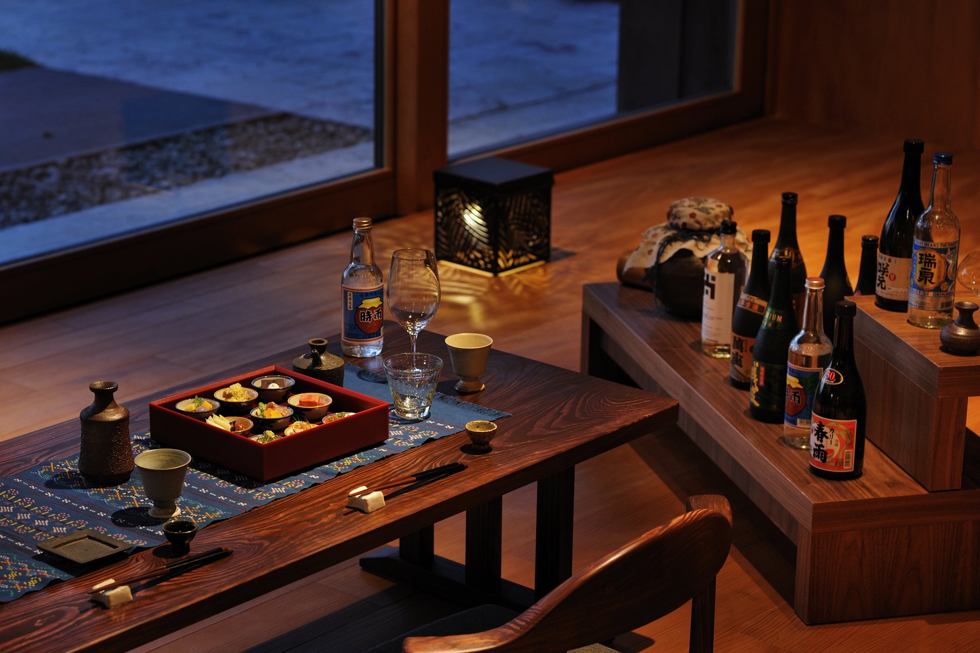 敷地内にある道場が、プラン限定で特別なプライベートバーに変わります。バーには、県内各地の酒造から20種類以上の泡盛を揃えました。酵母や蒸留方法など酒造それぞれの違いや拘りを聴き、まずは泡盛を選び、そして浅漬けからスイーツまで、9種類の肴を詰めた「泡盛ダイアログセット」から好きな肴を合わせます。泡盛と肴、多様な組み合わせを楽しみながら、夜更けまで泡盛談義に花を咲かせます。