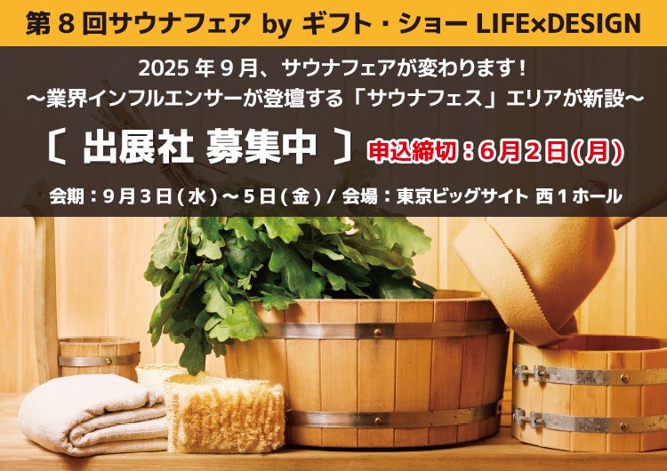 株式会社ビジネスガイド社(本社:東京都台東区、芳賀信享社長)は9月3日~5日、サウナ設備・グッズ・アパレルから食品まで、サウナに関するすべてが揃う、日本最大級(※1)のBtoB専門展示会「第8回サウナフェア」を「第18回LIFE×DESIGN」内(会場:東京ビッグサイト西展示棟)にて開催します。現在出展社を募集しており、今回は会場をリニューアルし、多くの企業に販路開拓の機会をご提供します。