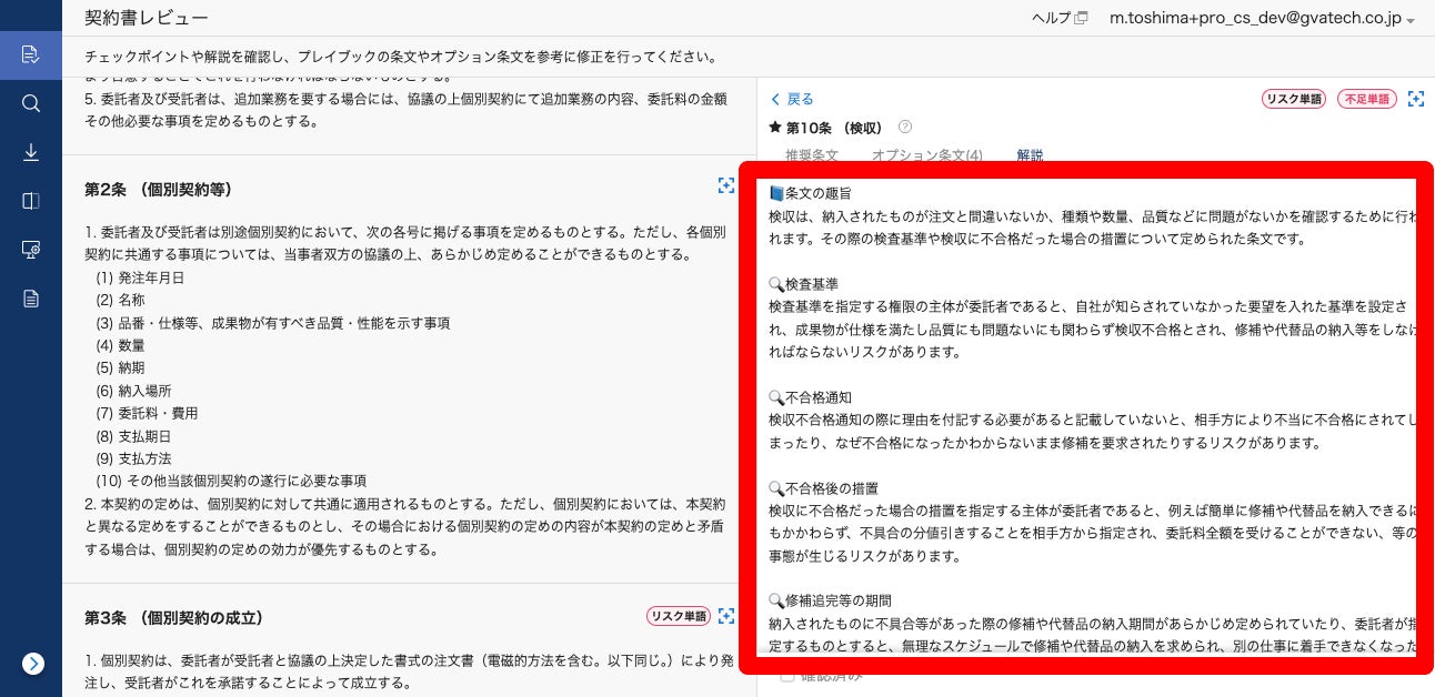 今回のアップデートにより、契約書レビューに不慣れな方や、慣れない契約書類型のレビューを行う際に、詳細を学びながらレビューを進めることができるようになります。