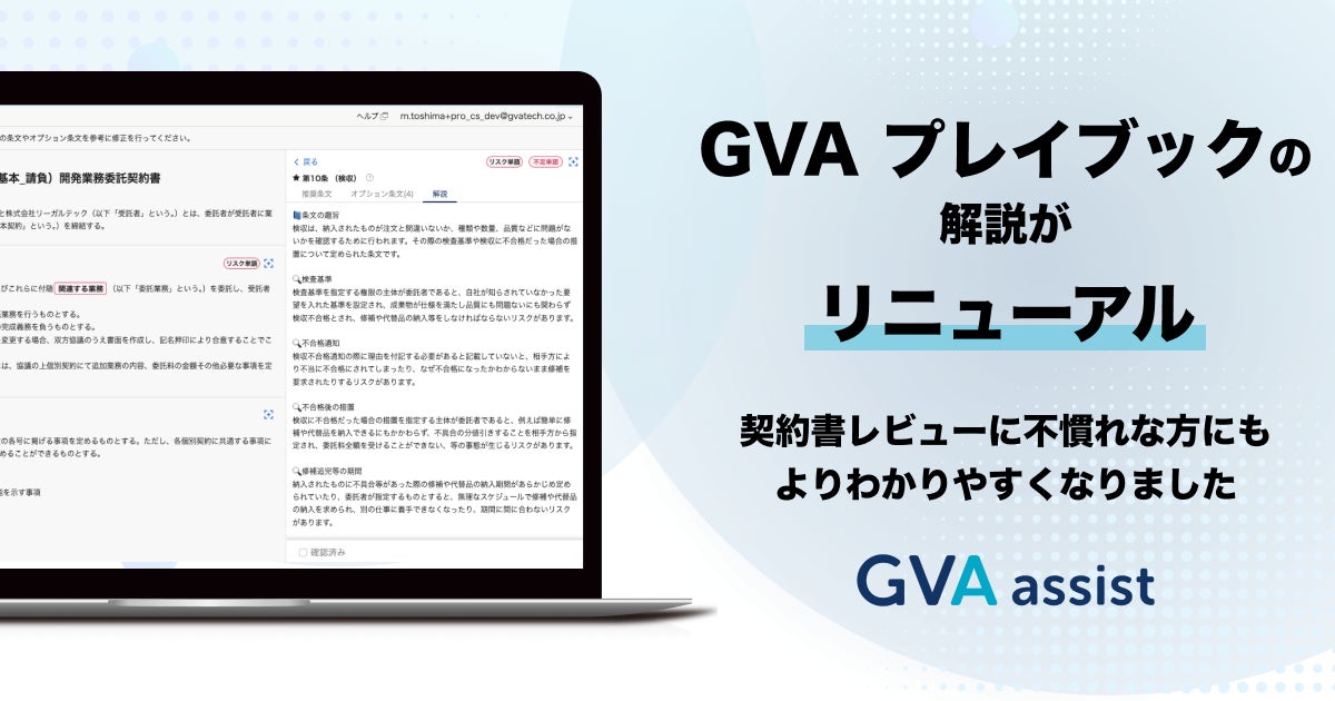 GVA TECH株式会社(本社:東京都渋谷区、代表取締役:山本 俊、以下GVA TECH)は、AI契約書レビュー支援クラウド「GVA assist(ジーヴァ アシスト)」に標準搭載しているGVA プレイブックの解説をリニューアルしたことをお知らせします。