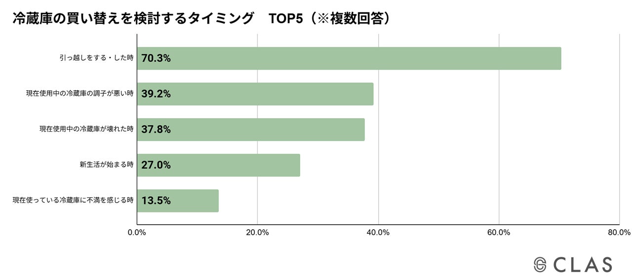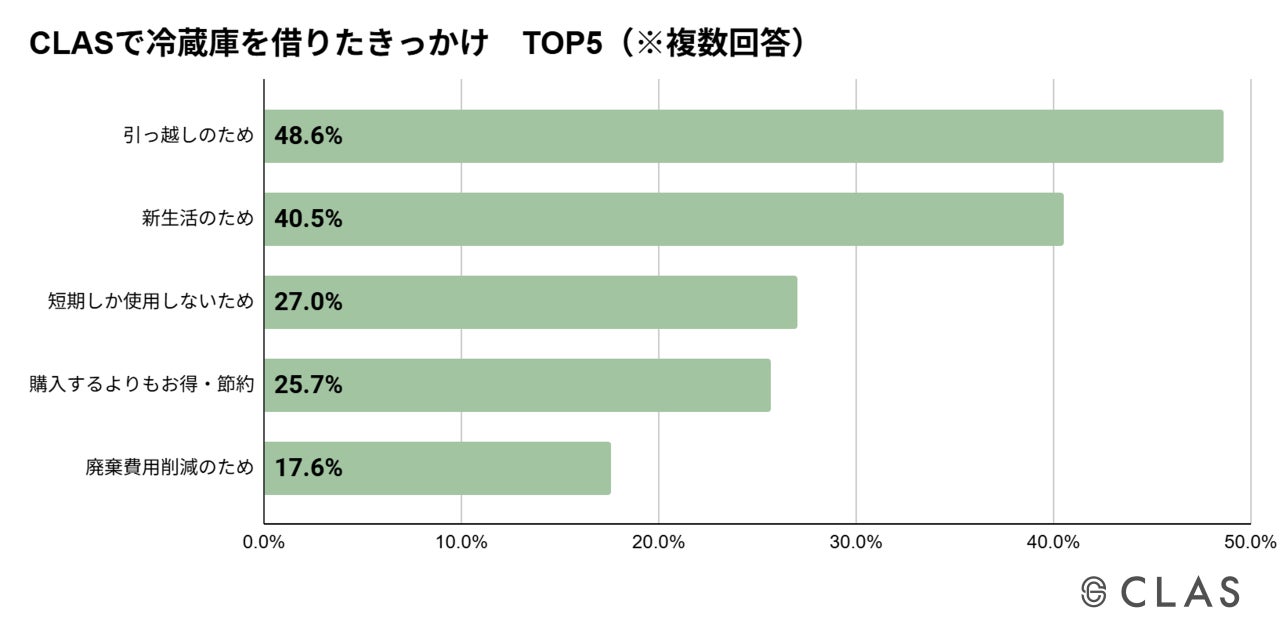 CLASで冷蔵庫を借りたきっかけは、1位「引っ越しのため」(48.6%)、2位「新生活のため」(40.5%)、3位「短期しか使用しないため」(27.0%)、4位「購入するよりもお得・節約」(25.7%)、5位「廃棄費用削減のため」(17.6%)となっており、単に利用するだけではなく、廃棄までを見据えてレンタル・サブスクを選択する方が多数いることがわかりました。