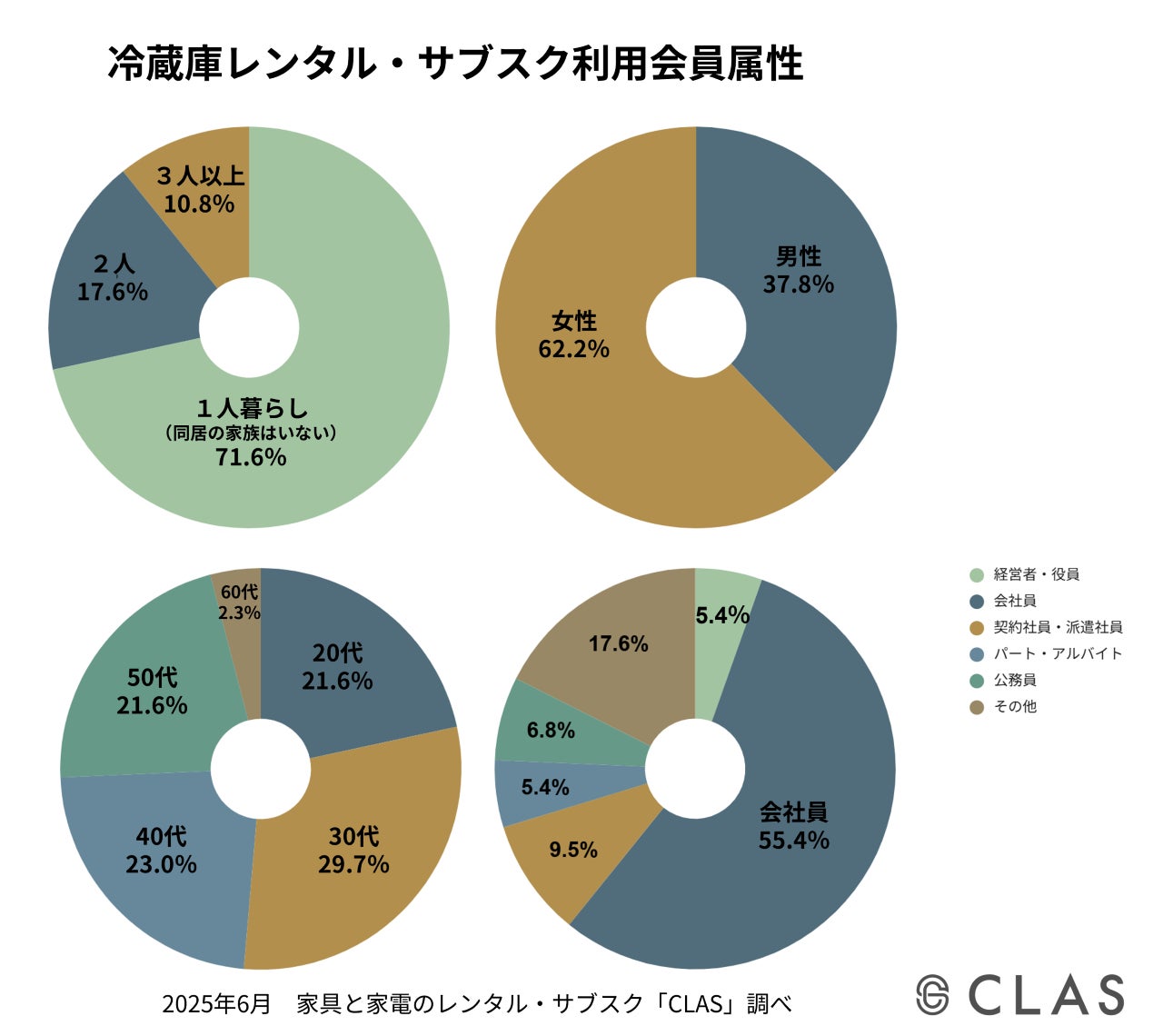 CLASのレンタル・サブスクで冷蔵庫を利用した経験のある方のうち、「1人暮らし(同居の家族はいない)」が71.6%と最も多い結果となりました。利用者の男女比は男性37.8%、女性62.2%と女性比率が高く、年代別では30代が29.7%と最も多く、次いで40代が23.0%でした。職種は会社員が55.4%と半数以上を占めています。