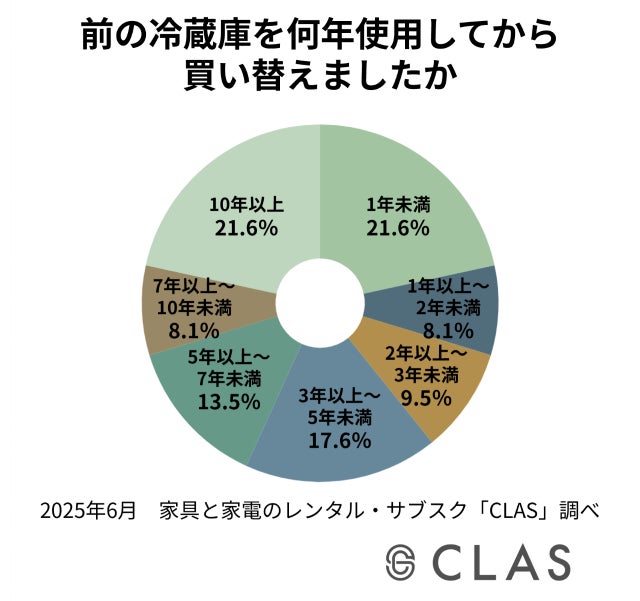CLASユーザーが前の冷蔵庫から買い替えるまでの使用年数は、「1年未満」と「10年以上」が同率で21.6%となっており、比較的早い買い替えと長期使用の二極化にある傾向が見られます。また、「1年以上~2年未満」(8.1%)、「2年以上~3年未満」(9.5%)、「3年以上~5年未満」(17.6%)と、これらを合わせると全体の35.2%が5年未満で冷蔵庫を買い替えていることから、耐用年数よりも早い段階で買い替える人が一定数いるようです。