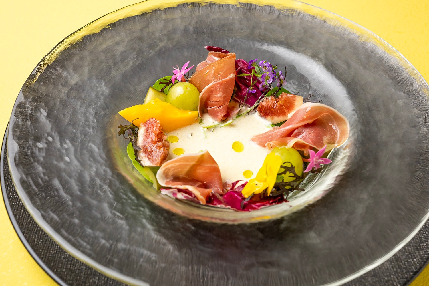 スペイン産ハモンセラーノとガスパチョビアンコのフルッタート風 〜果樹園にて〜
