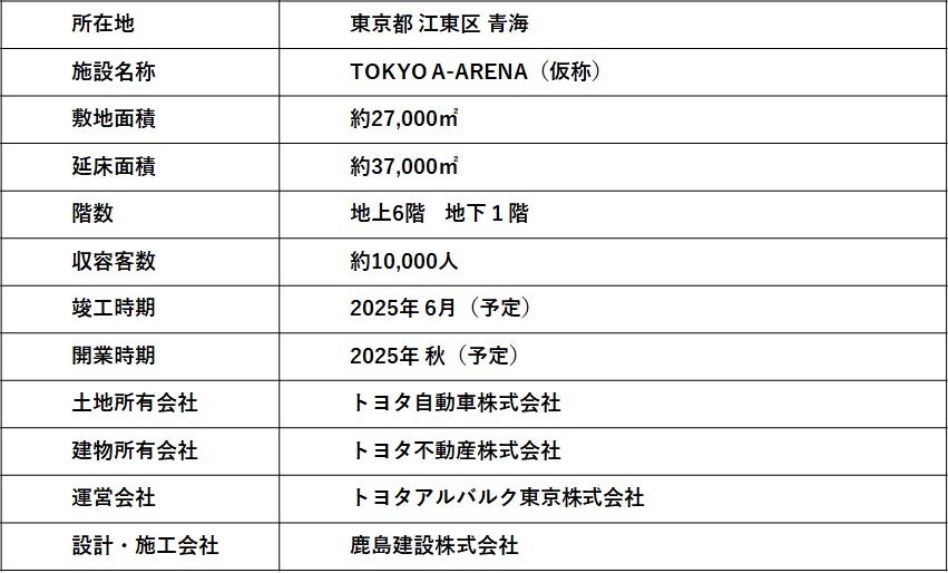 トヨタ自動車株式会社(本社:愛知県豊田市、代表取締役社長:佐藤 恒治)、トヨタ不動産株式会社(本社:名古屋市中村区、取締役社長:山村 知秀)、トヨタアルバルク東京株式会社(本社:東京都文京区、代表取締役社長:林 邦彦)の3社で協働して推進する「TOKYO A-ARENA PROJECT (東京都江東区青海 以下、本プロジェクト)」において、2025年6月の竣工、秋の開業に向けた着工に際し、本日、トヨタ不動産株式会社は施主として「TOKYO A-ARENA(仮称)」の起工式を執り行いましたのでお知らせいたします。