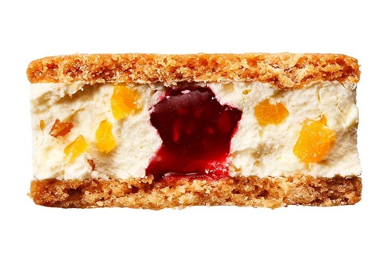 ドライアプリコットを加えたさわやかなチーズクリームの中から、ラズベリージャムがとろけだす、まるでラズベリーチーズケーキのような味わい。アプリコットの食感もたのしく、一口食べ進めるごとにさまざまな味わいが広がります。