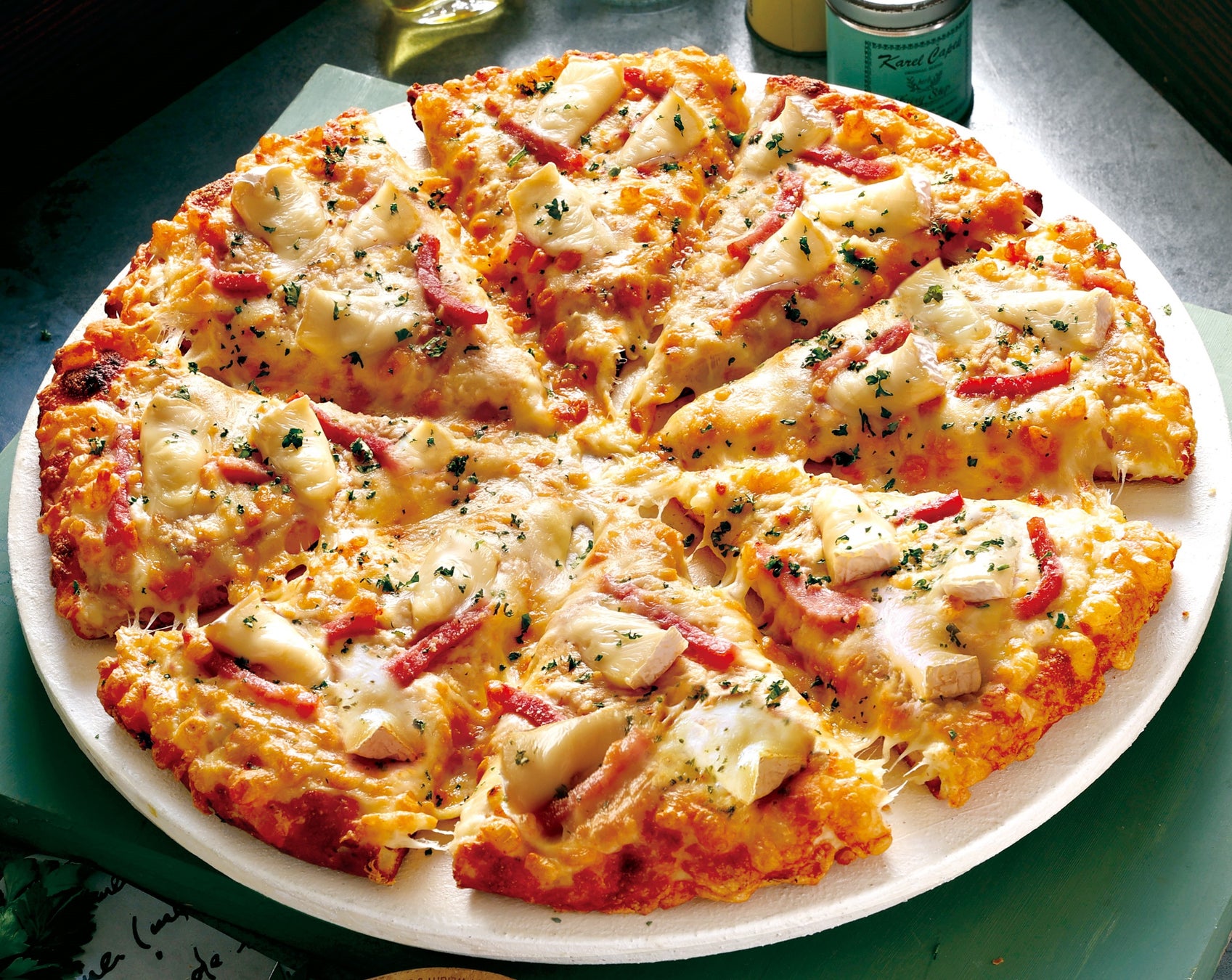 北海道産カマンベールと厚切りベーコン、ポルチーニソースで仕上げた「カマンベールとベーコンのピザ」、