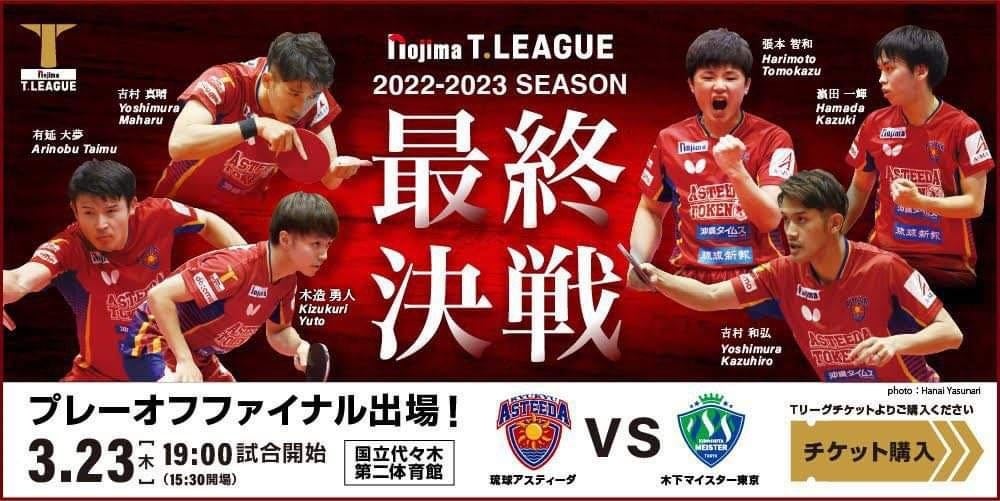 琉球アスティーダスポーツクラブ株式会社(所在地:沖縄県中頭郡中城村、代表取締役会長:早川周作)が運営するプロ卓球チーム「琉球アスティーダ」は、2023年3月23 日(木)に代々木第二体育館で開催される「ノジマTリーグ2022-2023シーズン」のプレーオフファイナルにていよいよ日本一をかけた頂上決戦に挑みます。