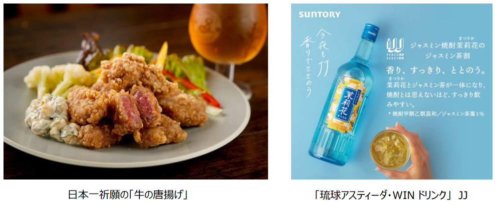 | ☆日本一を祈願して「牛の唐揚げ」を特別販売 (※3月18日の那覇めしグランプリに先駆けた特別販売) ☆「琉球アスティーダ・WINドリンク」 JJの販売 (※JJ=ジャスミン茶×ジャスミン焼酎 茉莉花) ☆会計時に「琉球アスティーダ日本一!」で、飲み放題が特別価格に (※土日祝前日:2時間980円、 日~木:3時間980円、会計時に上記合言葉をお伝えいただいた方限定) |