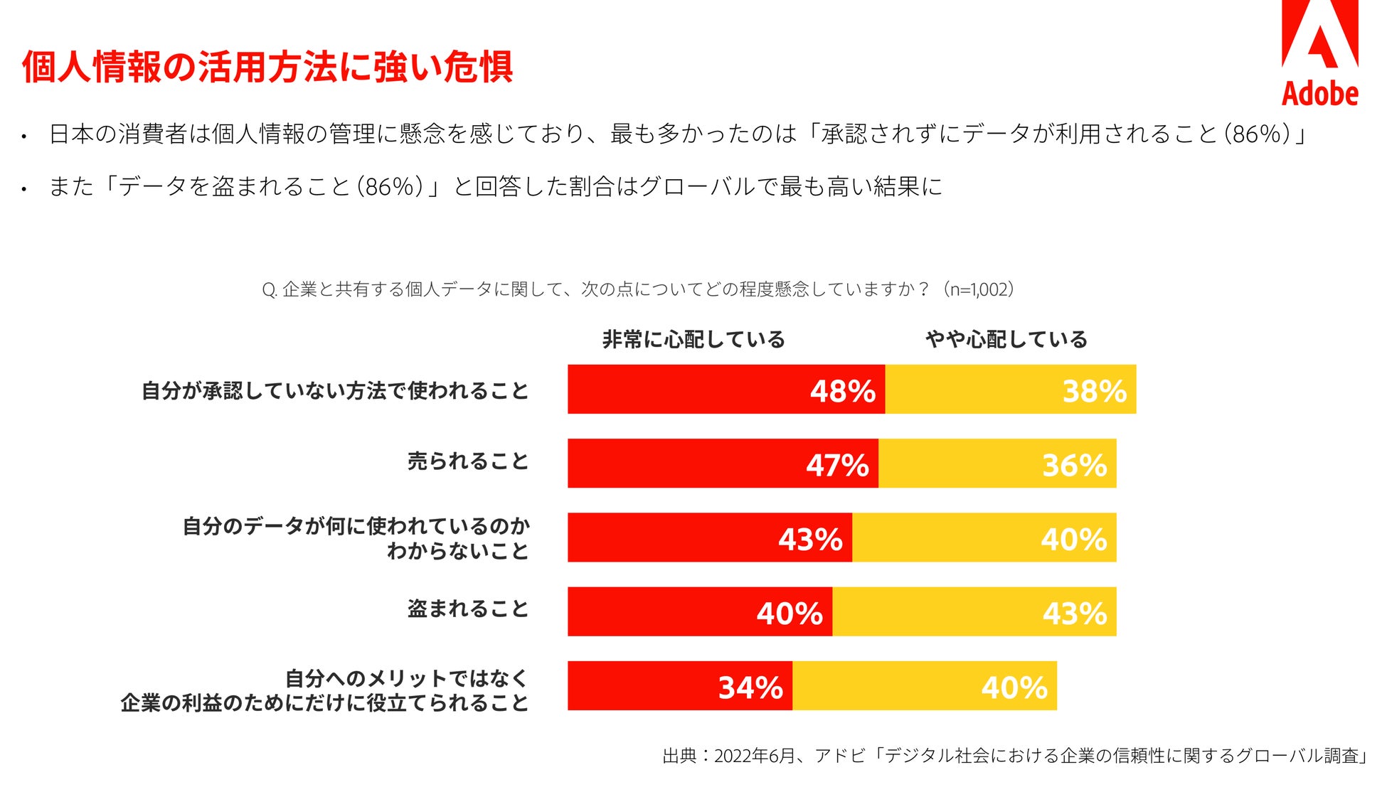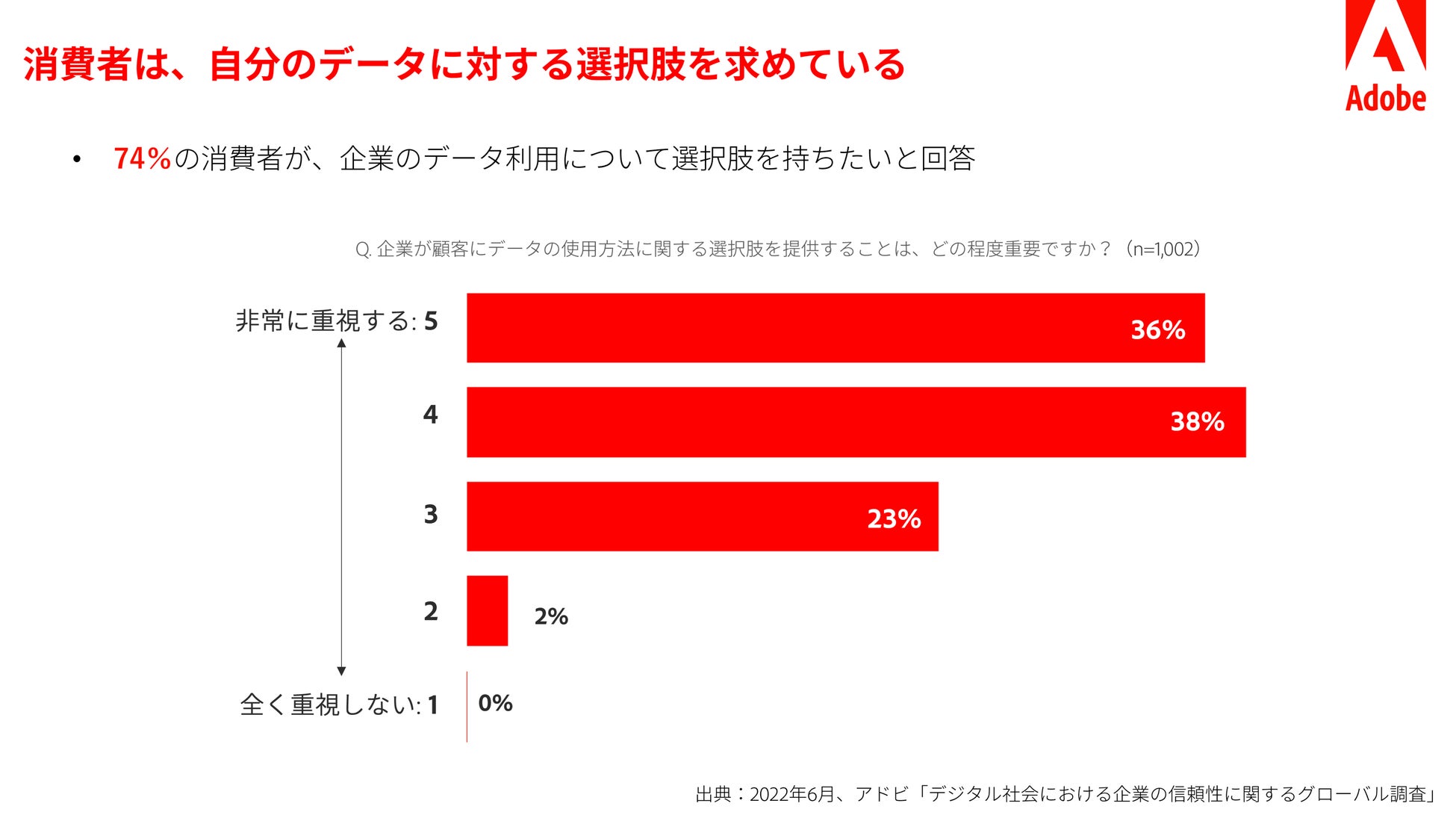 今回の「Adobe Trust Report 2022」では、消費者側でデータ共有に対する選択肢を維持しつつ、消費者の気持ちに寄り添った、きめ細やかなデジタル体験が企業の信頼、さらには業績の向上につながることが明らかとなりました。パンデミックを経て、デジタルの顧客接点が重要性を増すなか、適切な顧客に対して適切なチャネルで適切な体験を提供する、パーソナライゼーションの見直しが求められています。