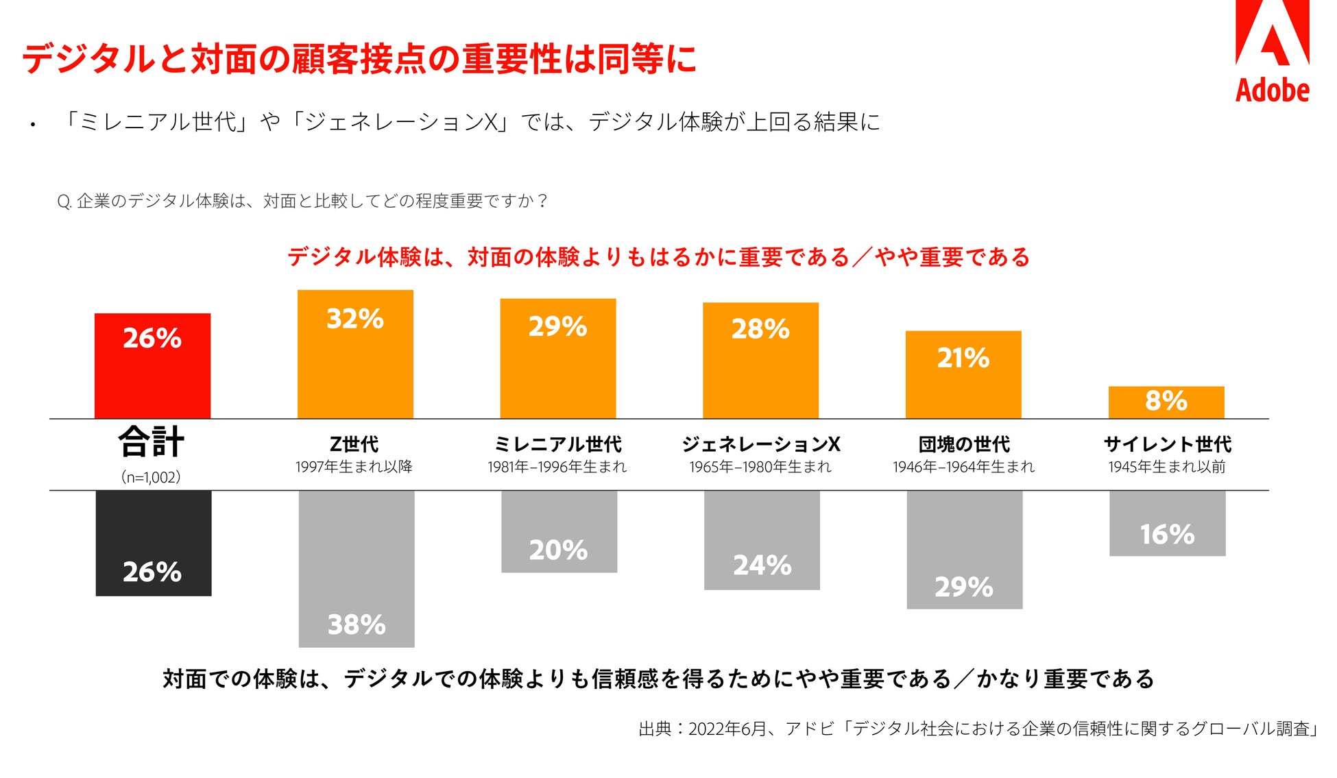 今回の調査では、日本の消費者がデジタルにおける顧客接点を対面と同様に重要と捉えていることが判明しました。世代別の回答を見てみると、ミレニアル世代やジェネレーションXでは、対面よりデジタル体験を重要視する傾向が明らかとなっており、約2年にわたるパンデミックを通じて、顧客体験が大きくデジタル化した様子がうかがえる結果となりました。